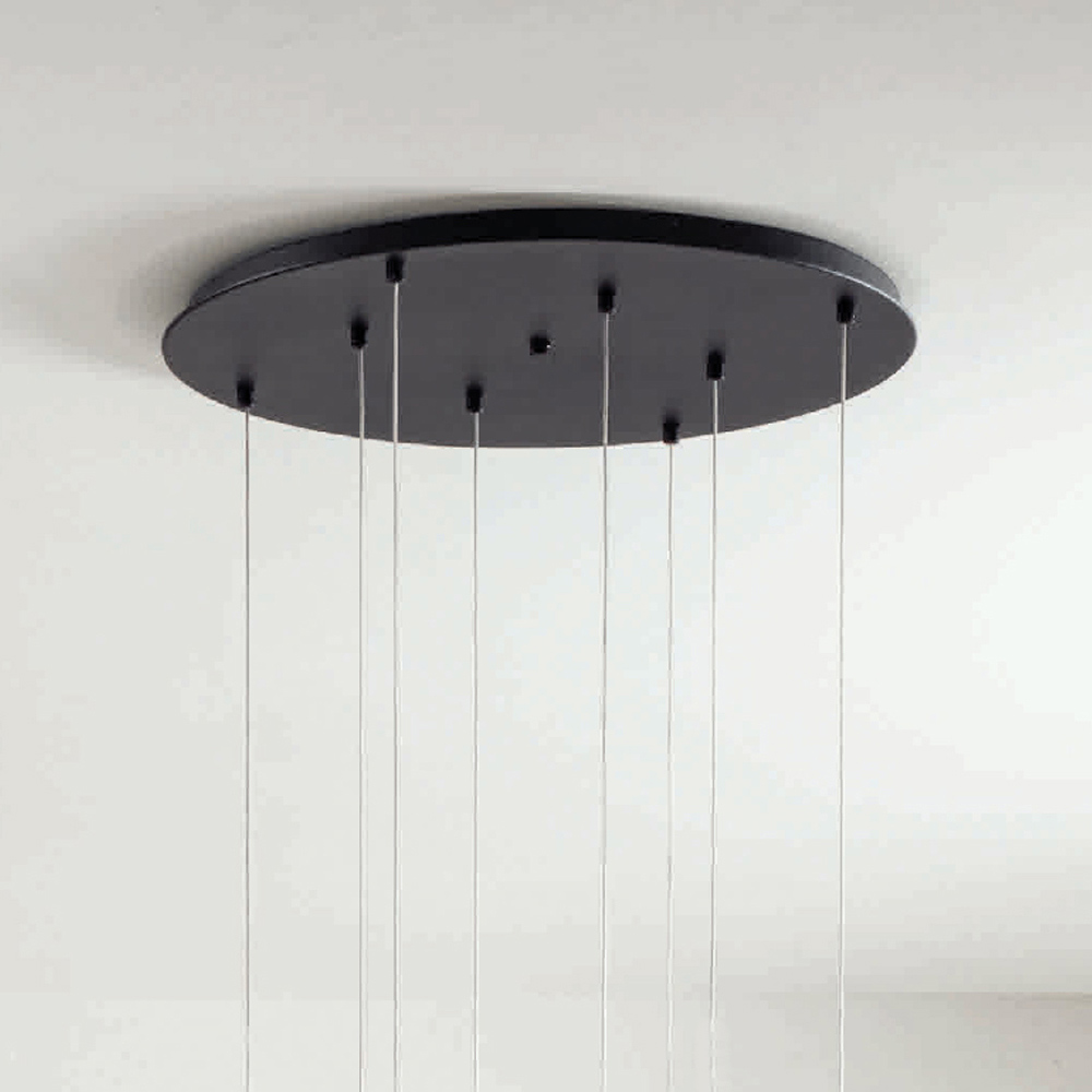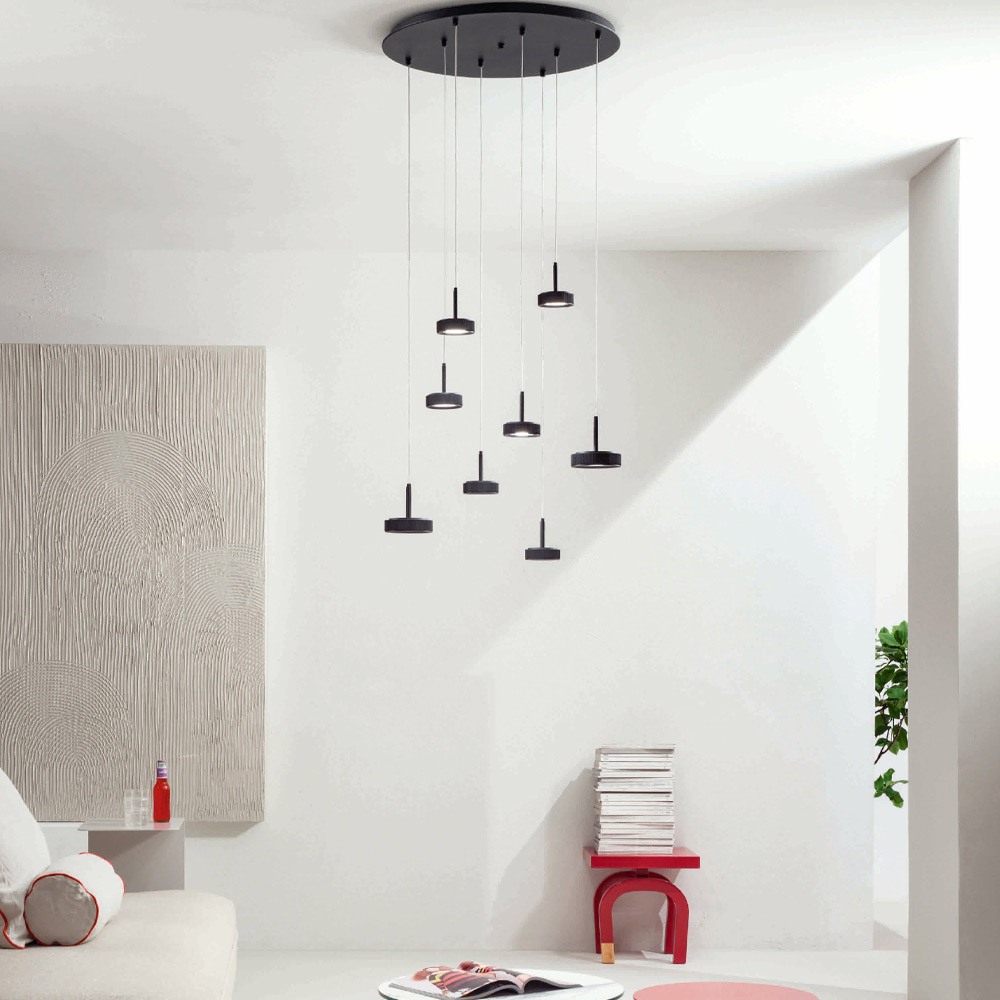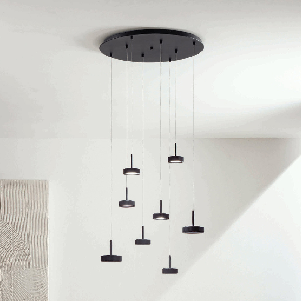 Lámpara de arañaproducida íntegramente en Italia realizada en metal pintado de negro con cables regulables en longitud y luces LED. Este producto tiene como objetivo realzar la tradición a través de un enfoque contemporáneo donde el estilo, la clase y la innovación se fusionan para crear nuevas fórmulas de diseño para amueblar e iluminar cualquier ambiente con gusto y carácter. Los puntos fuertes son la peculiaridad de las formas , la calidad de los materiales y la singularidad de la fuente de luz .