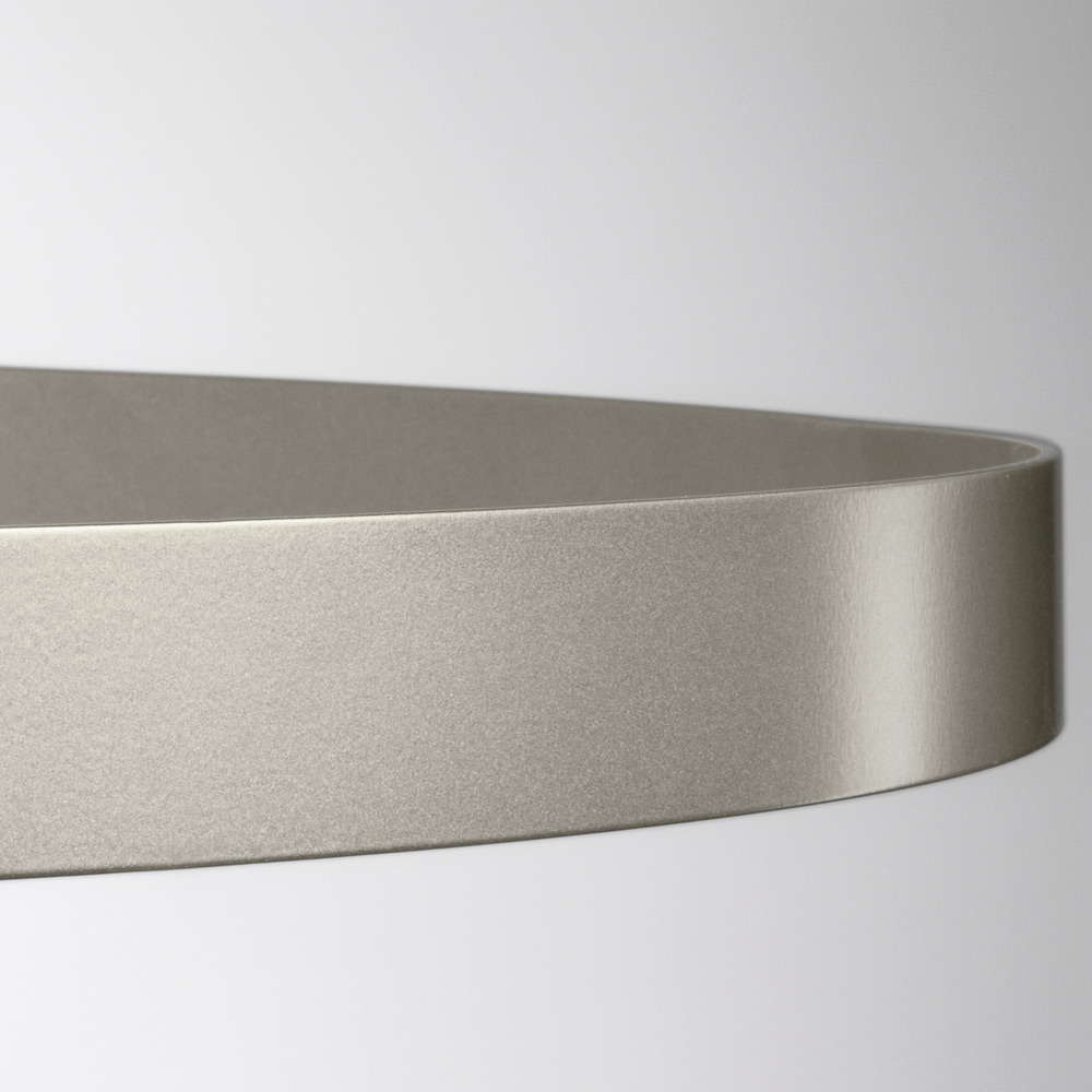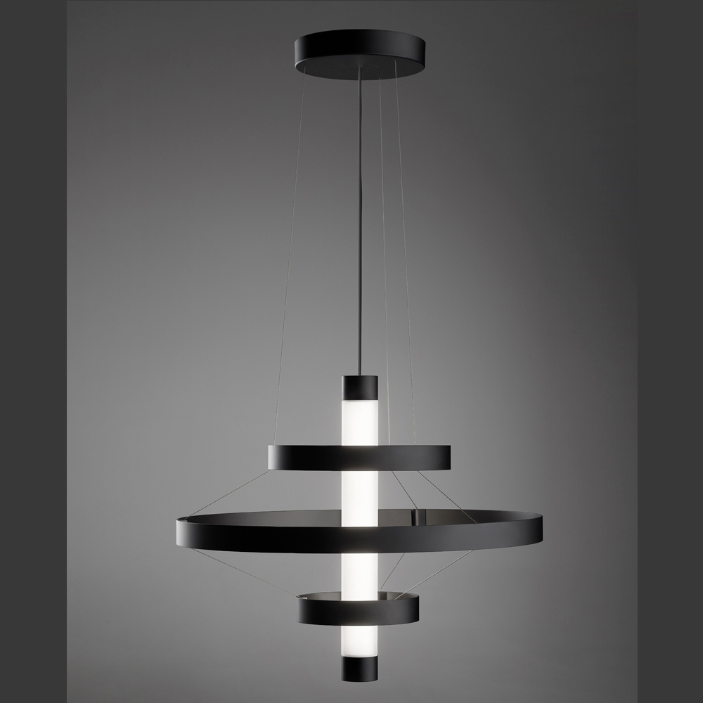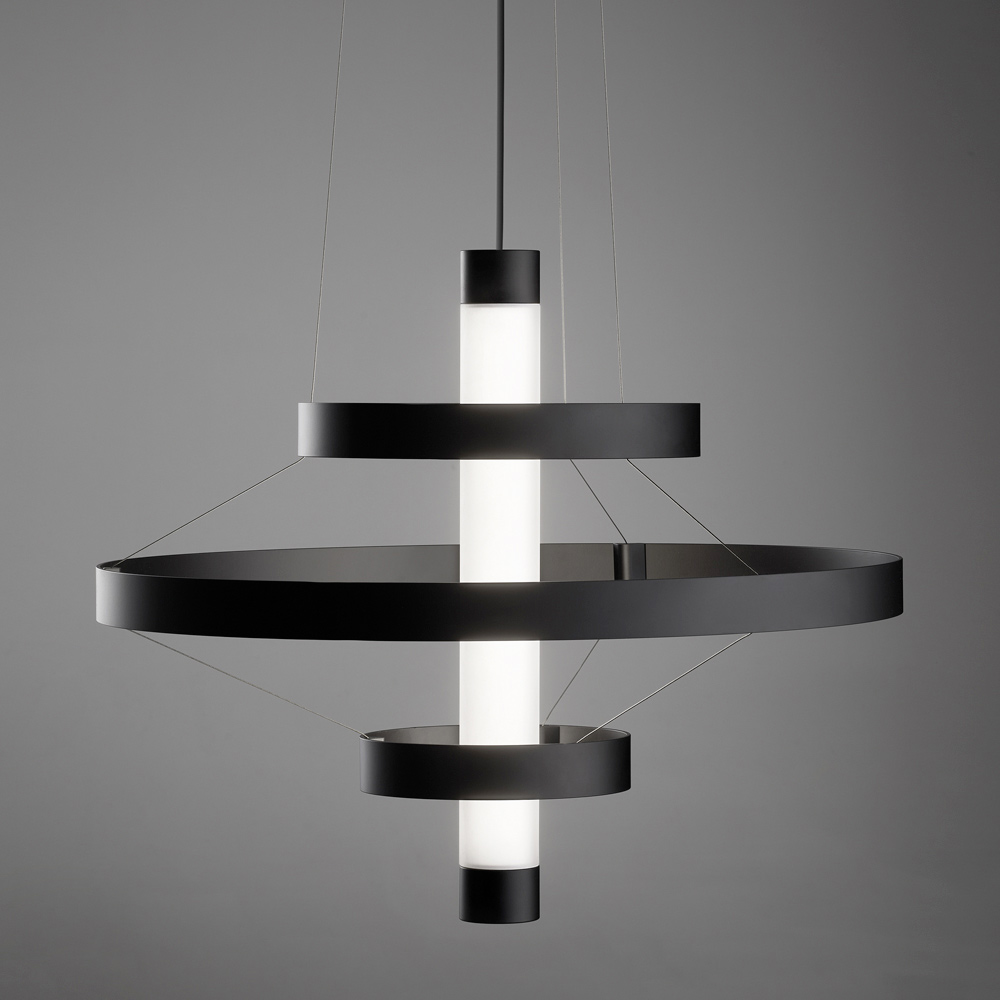 Lámpara de interior realizada con un cuerpo central de cristal, punto de apoyo de la luz y la energía, alrededor del cual se disponen una serie de anillos de diversos tamaños que parecen suspendidos en el espacio en aluminio.