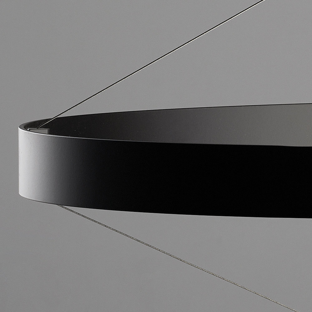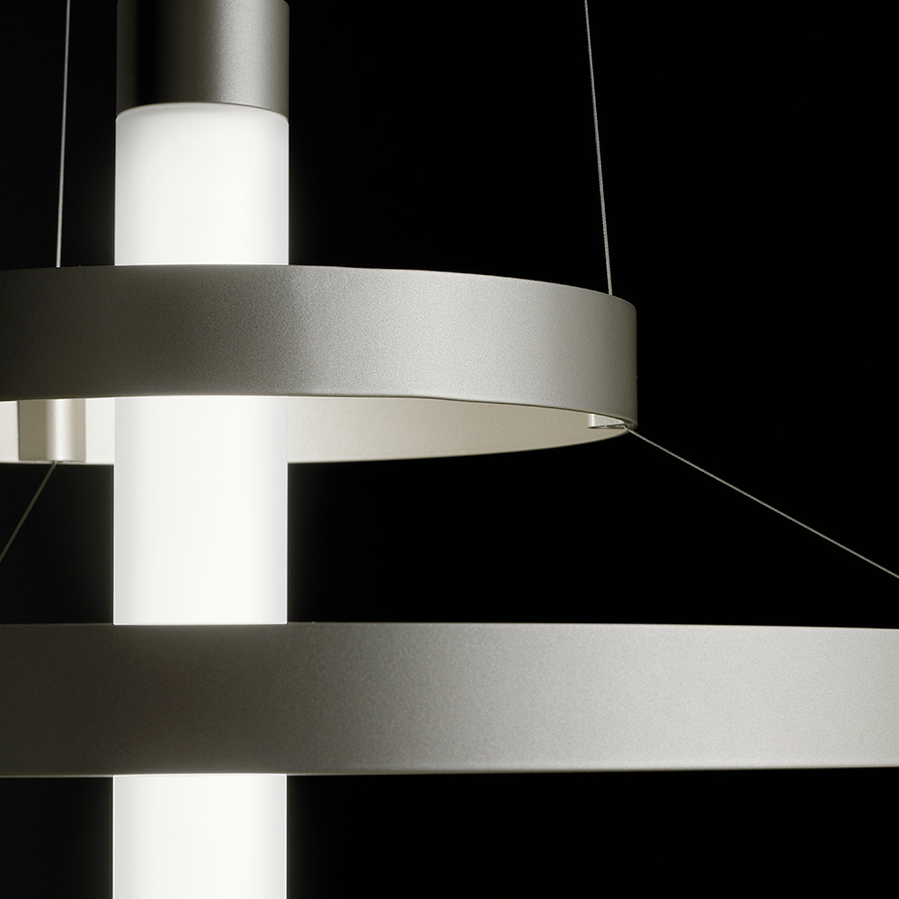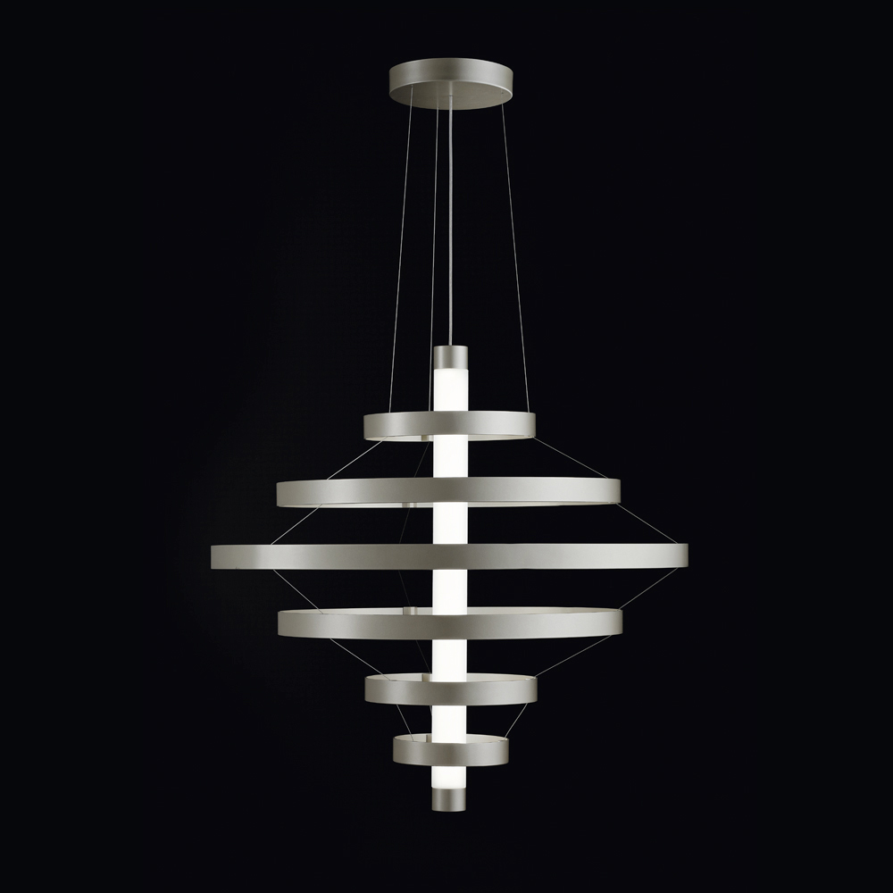 Lámpara de interior realizada con un cuerpo central de cristal, punto de apoyo de la luz y la energía, alrededor del cual se disponen una serie de anillos de diversos tamaños que parecen suspendidos en el espacio en aluminio.