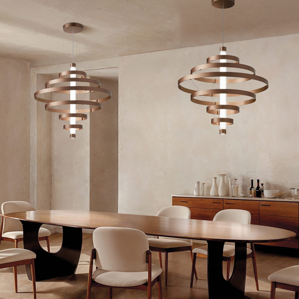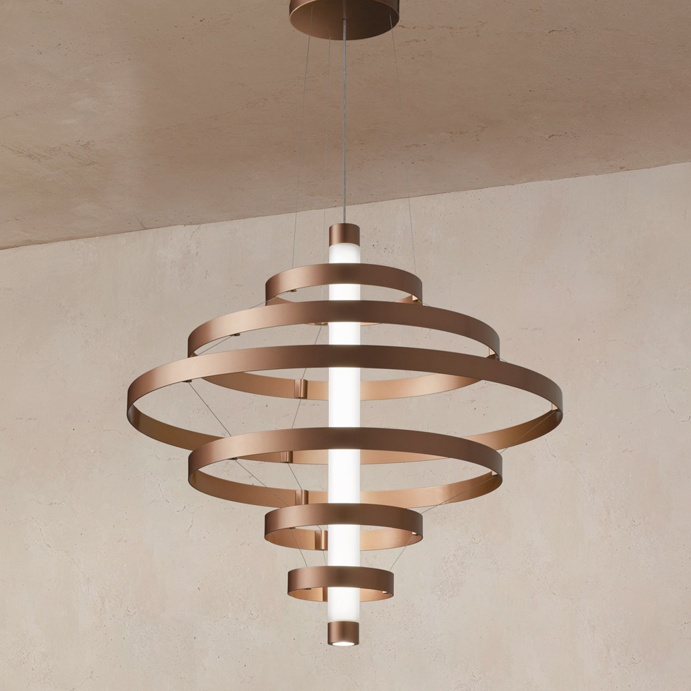 Esta lámpara colgante es una auténtica protagonista en cualquier espacio: una escultura luminosa que cautiva la mirada y aporta personalidad y prestigio al ambiente. La estructura está compuesta por una serie de anillos concéntricos de aluminio , dispuestos armoniosamente alrededor del cuerpo central, creando un efecto visual dinámico, elegante y tridimensional .