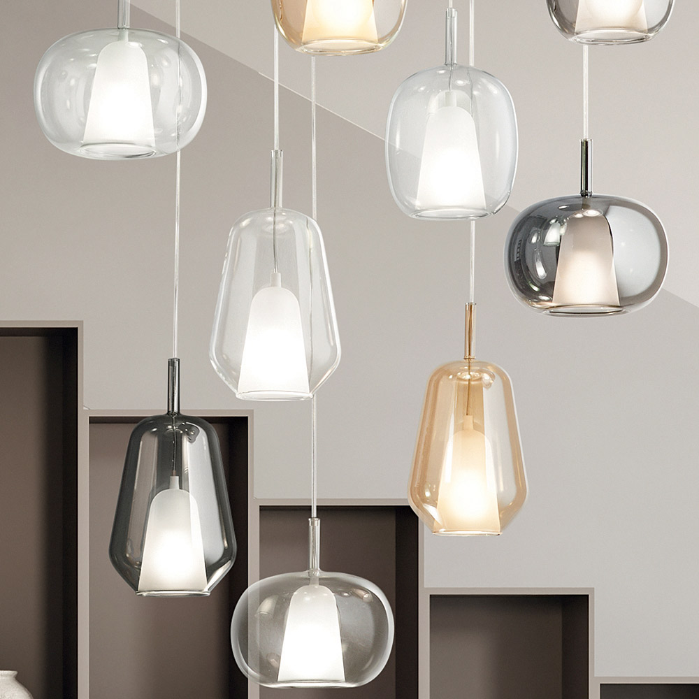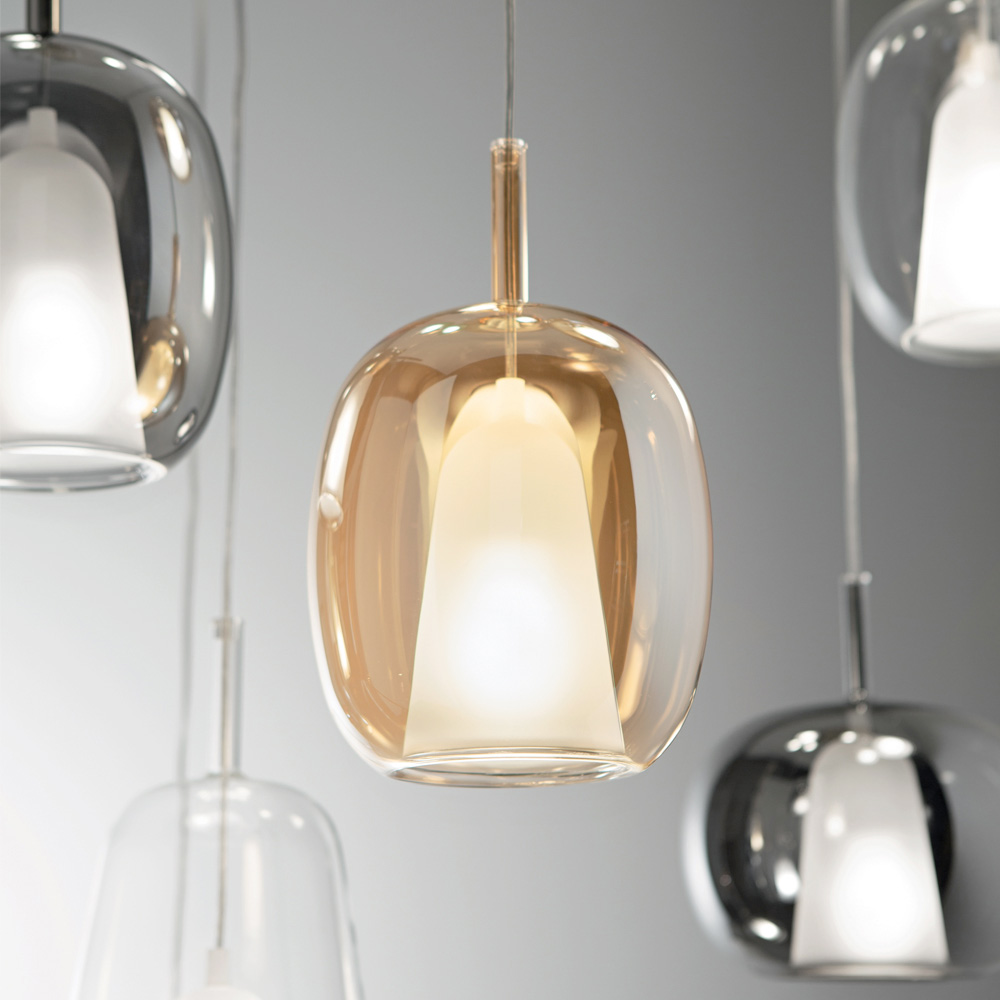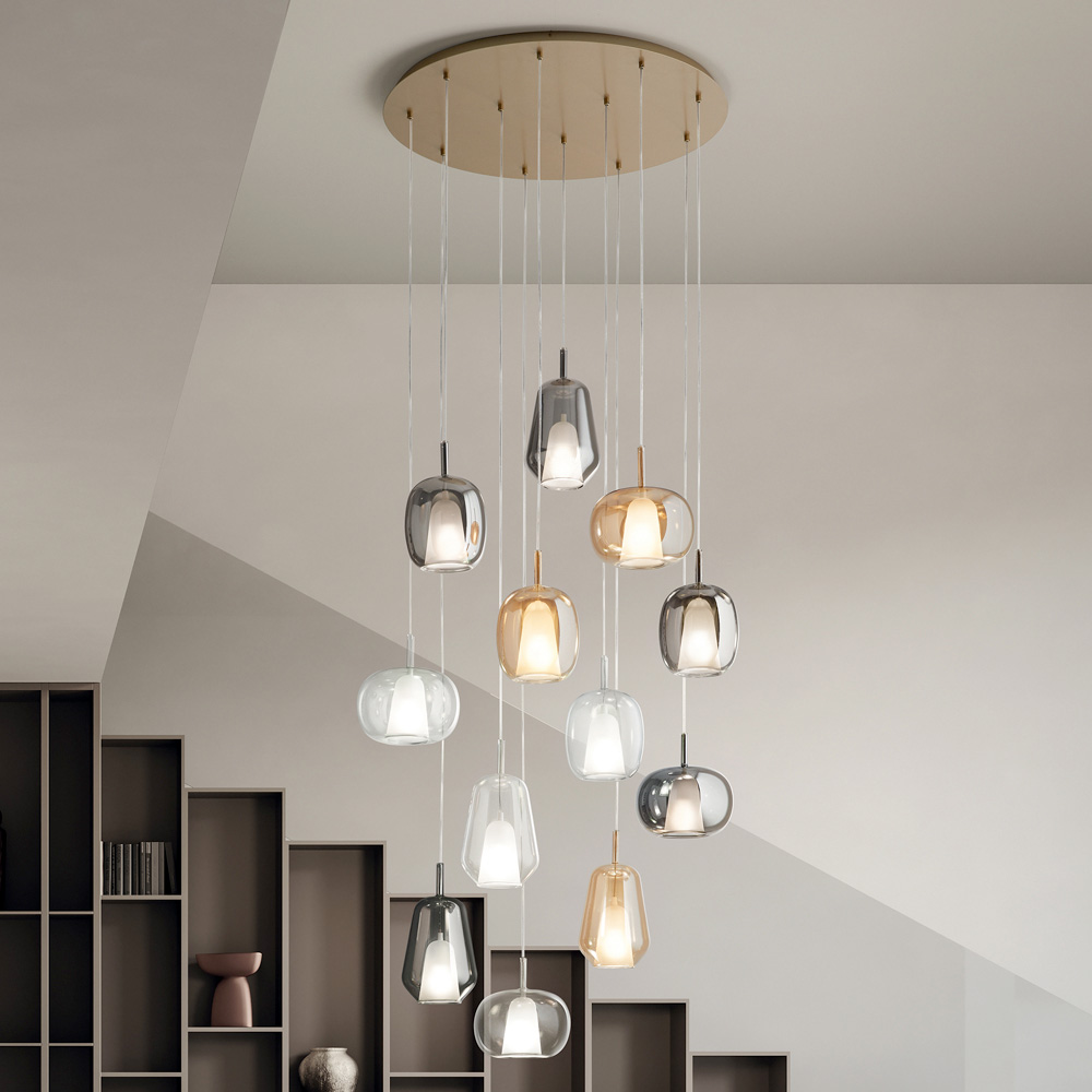 Lámpara de techo realizada con base en metal dorado y difusores de cristal soplado , caracterizada por una doble capa: interna en cristal satinado y externa en cristal coloreado . Casquillo en material polimérico para estabilizar el cable en posición central. Cables orientables con una longitud máxima de 250 cm.