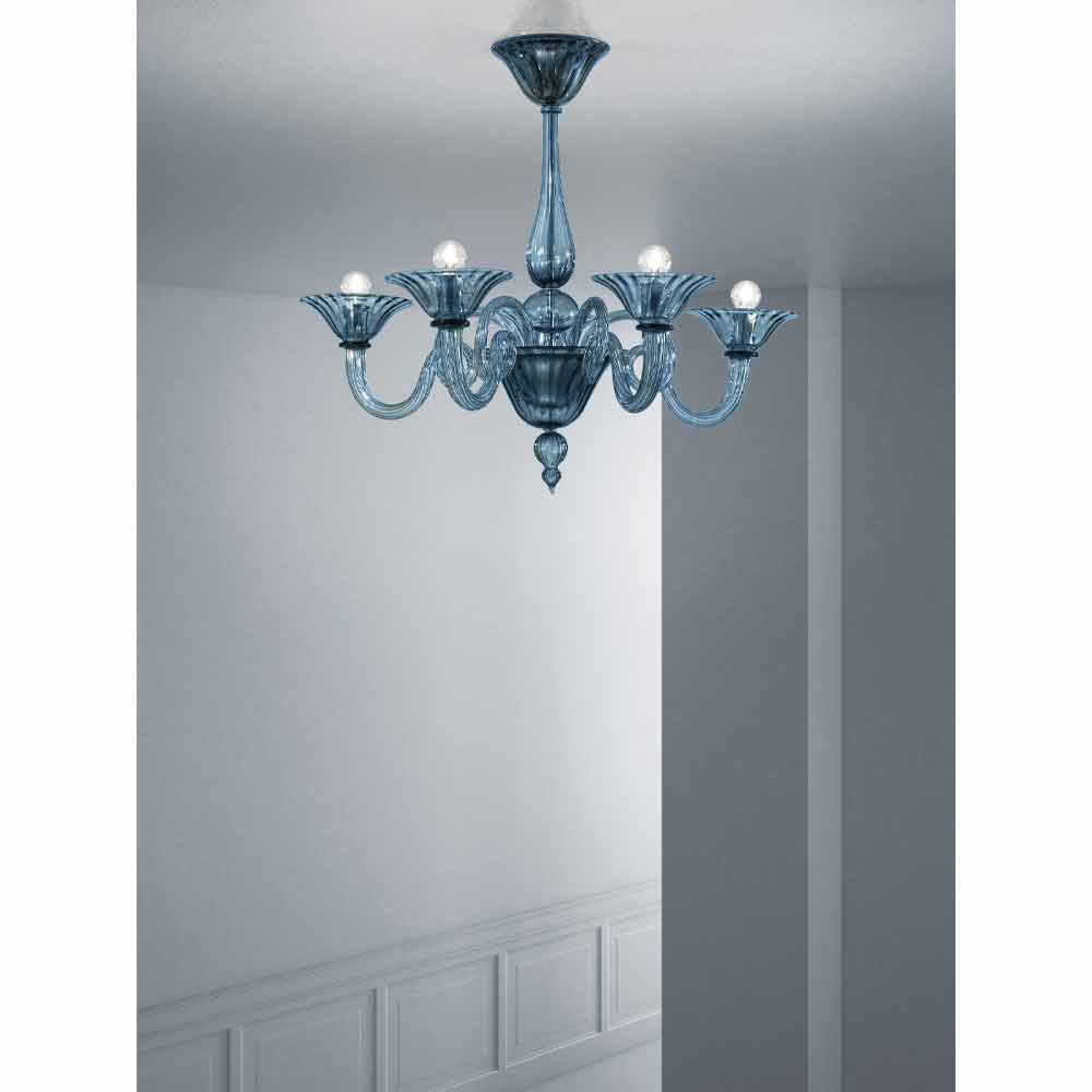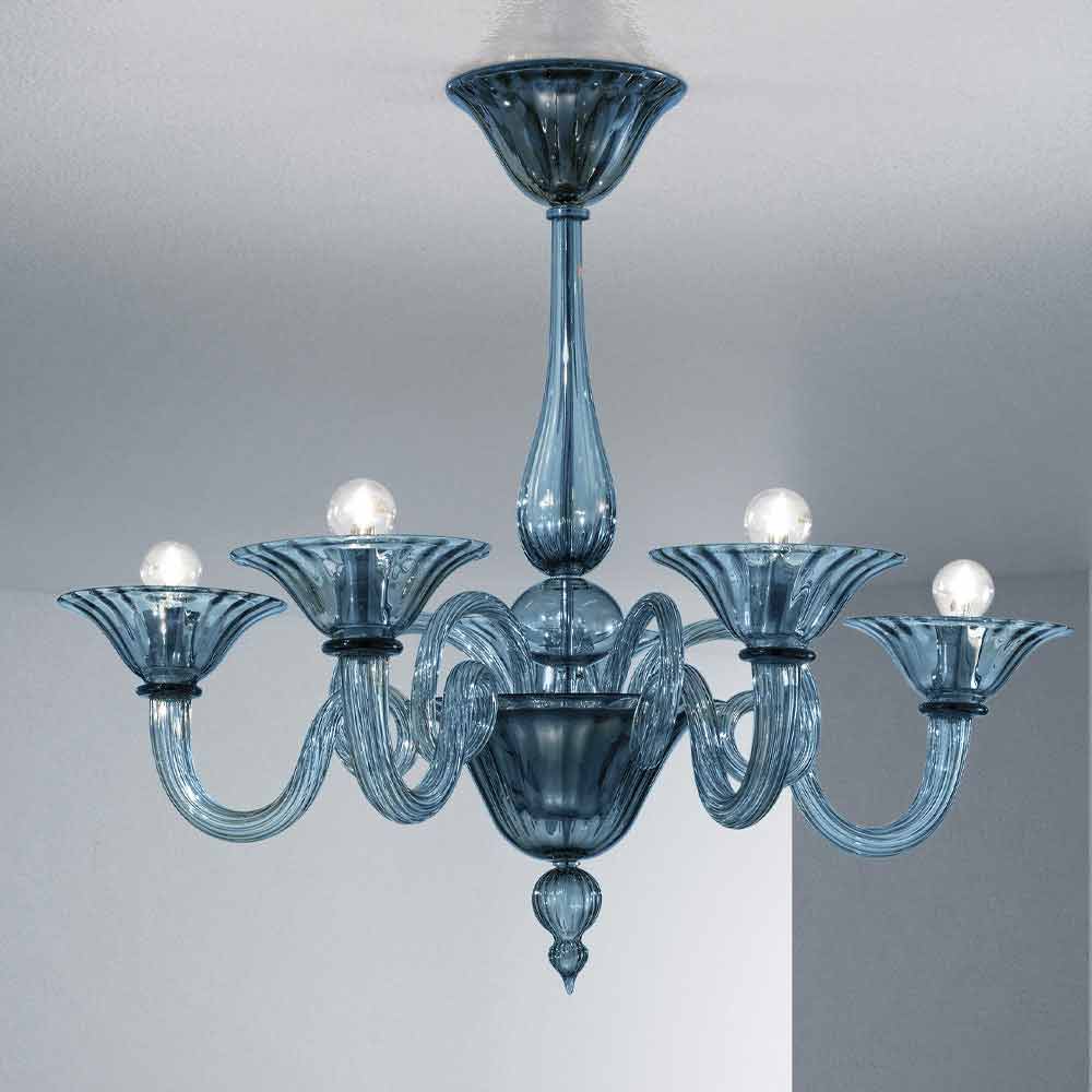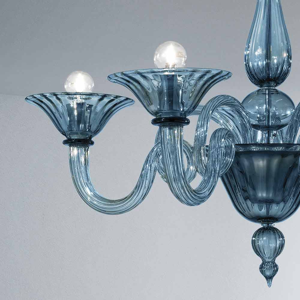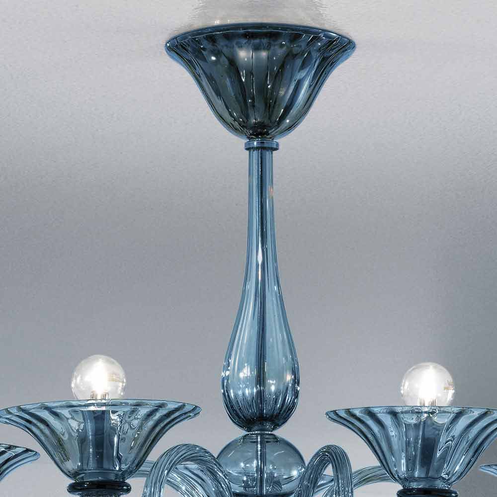 Lámpara de araña de cristal Venecia azul y metal, hecha a mano en Italia.