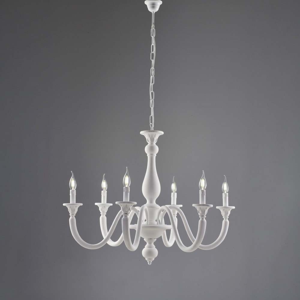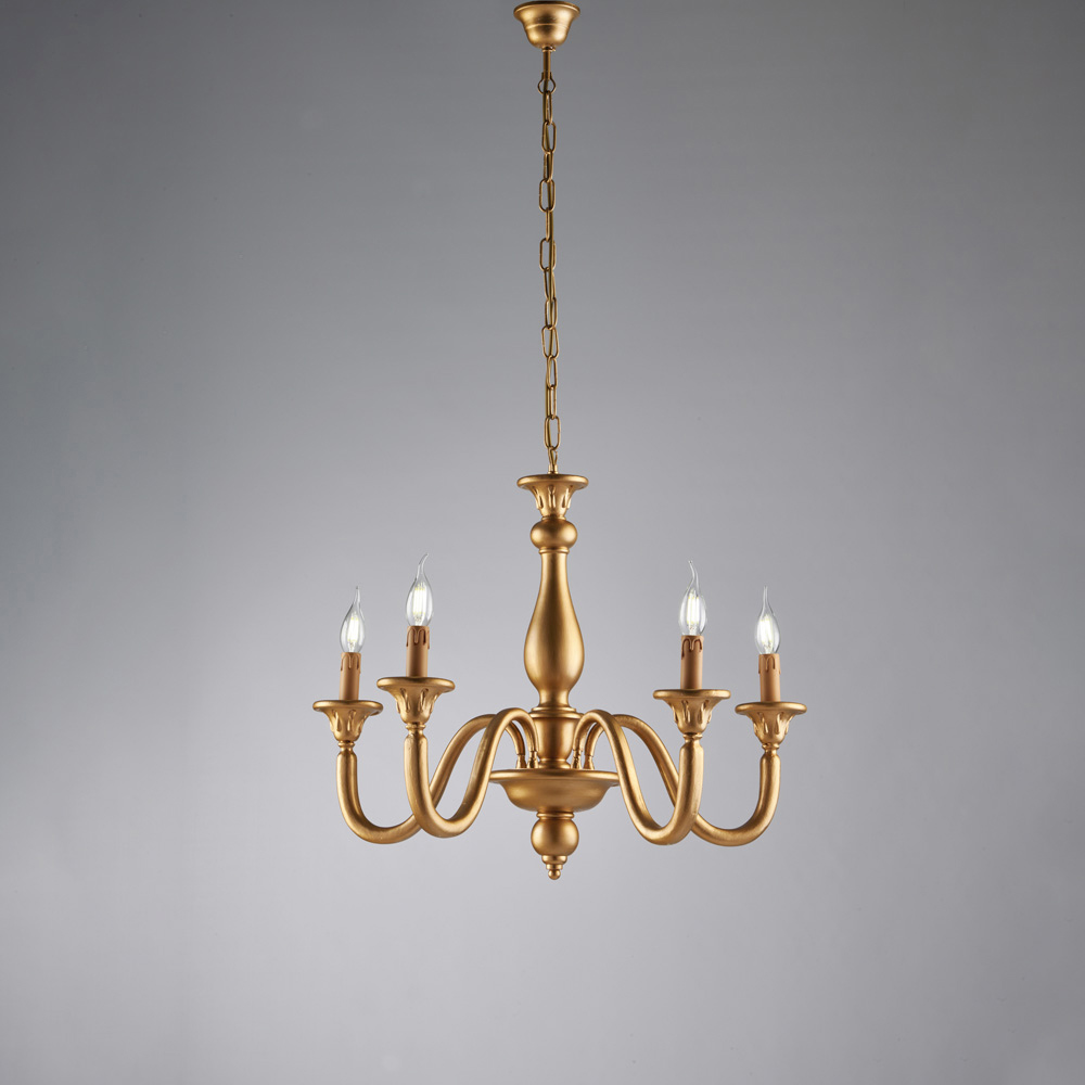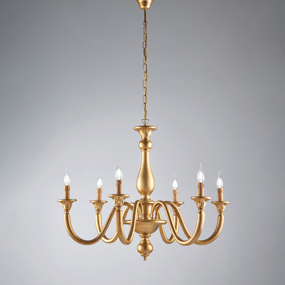 Elegante y atemporal, esta clásica lámpara de araña de madera artesanal interpreta con refinamiento el estilo tradicional italiano, combinando formas armoniosas y acabados cautivadores. Su esbelta estructura, con brazos curvos y luces tipo vela , aporta ligereza visual y crea una atmósfera cálida y acogedora, perfecta para espacios de elegancia atemporal.
