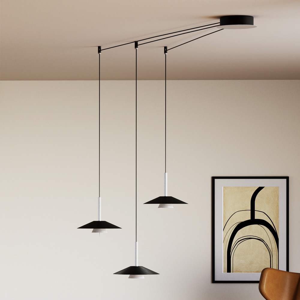 Esta lámpara es una fusión perfecta de diseño contemporáneo y elegancia industrial , diseñada para quienes aprecian los detalles refinados y una estética audaz. Su estructura geométrica, con un difusor cónico y un gran disco reflectante, crea un fascinante juego de volúmenes y contrastes , garantizando una luz direccional y envolvente .