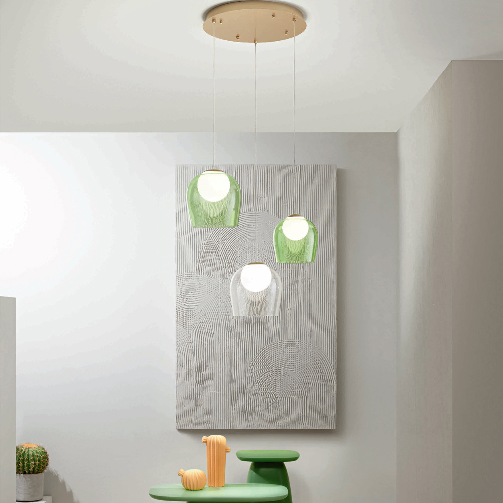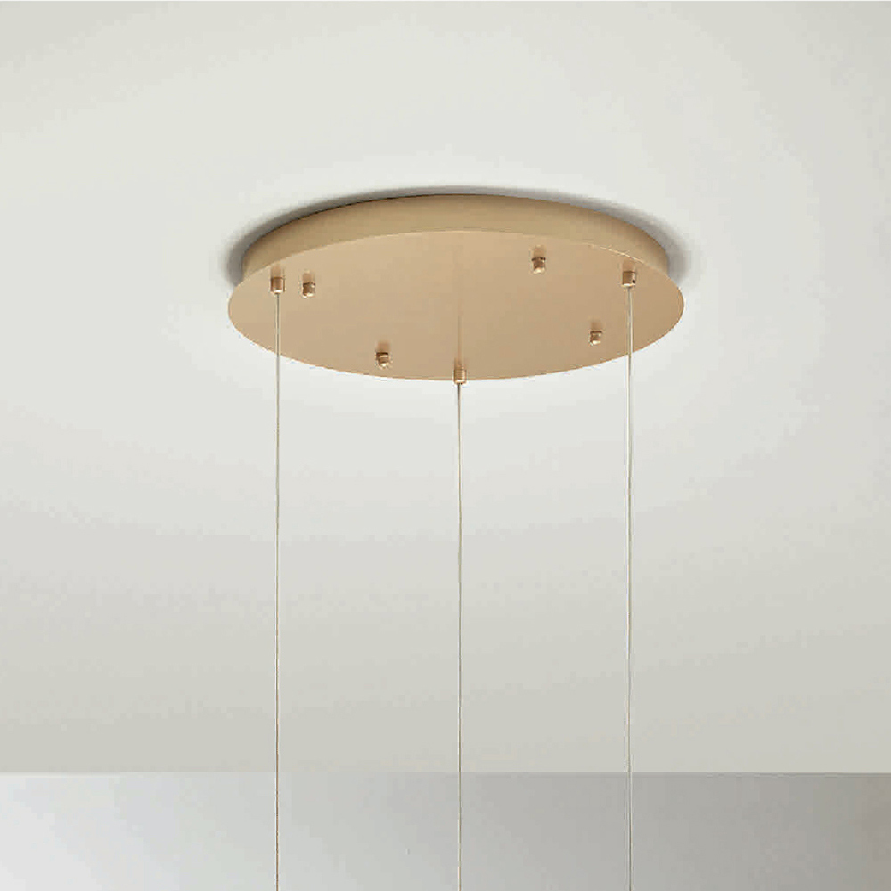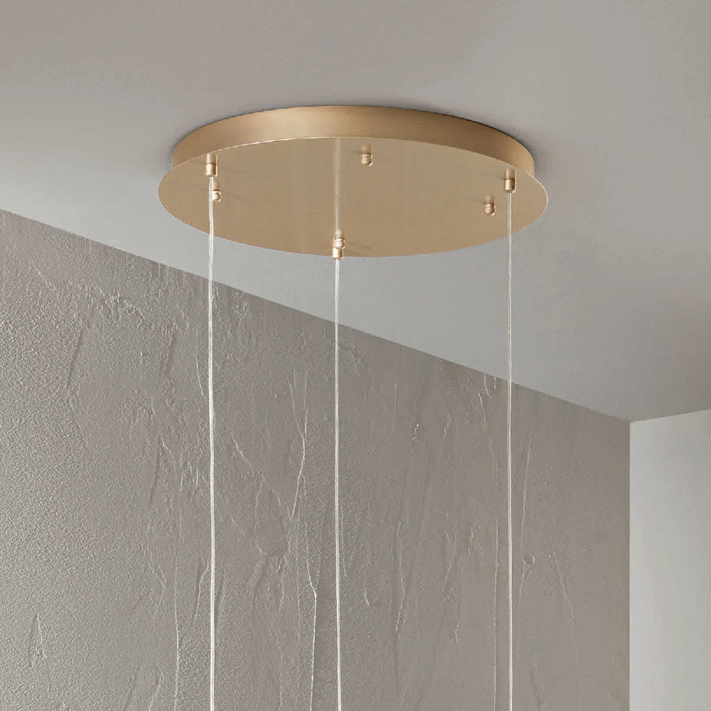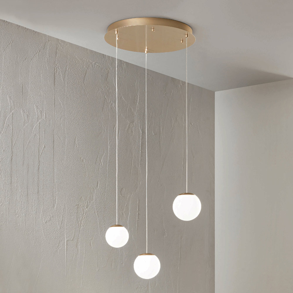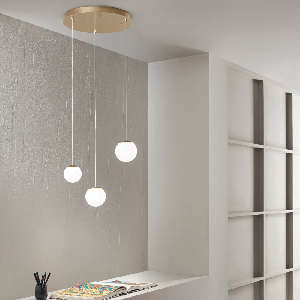 Araña íntegramente fabricada en Italia realizada en metal pintado acabado dorado y 3 luces LED con pantalla opcional en cristal coloreado que se puede quitar desenroscando la esfera de cristal. Este producto tiene como objetivo realzar la tradición a través de un enfoque contemporáneo donde el estilo, la clase y la innovación se fusionan para crear nuevas fórmulas de diseño para amueblar e iluminar cualquier ambiente con gusto y carácter. Los puntos fuertes son la peculiaridad de las formas , la calidad de los materiales y la singularidad de la fuente de luz .
