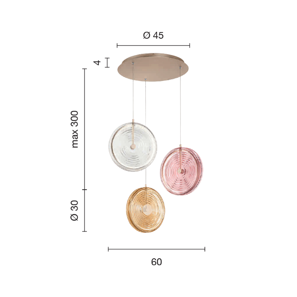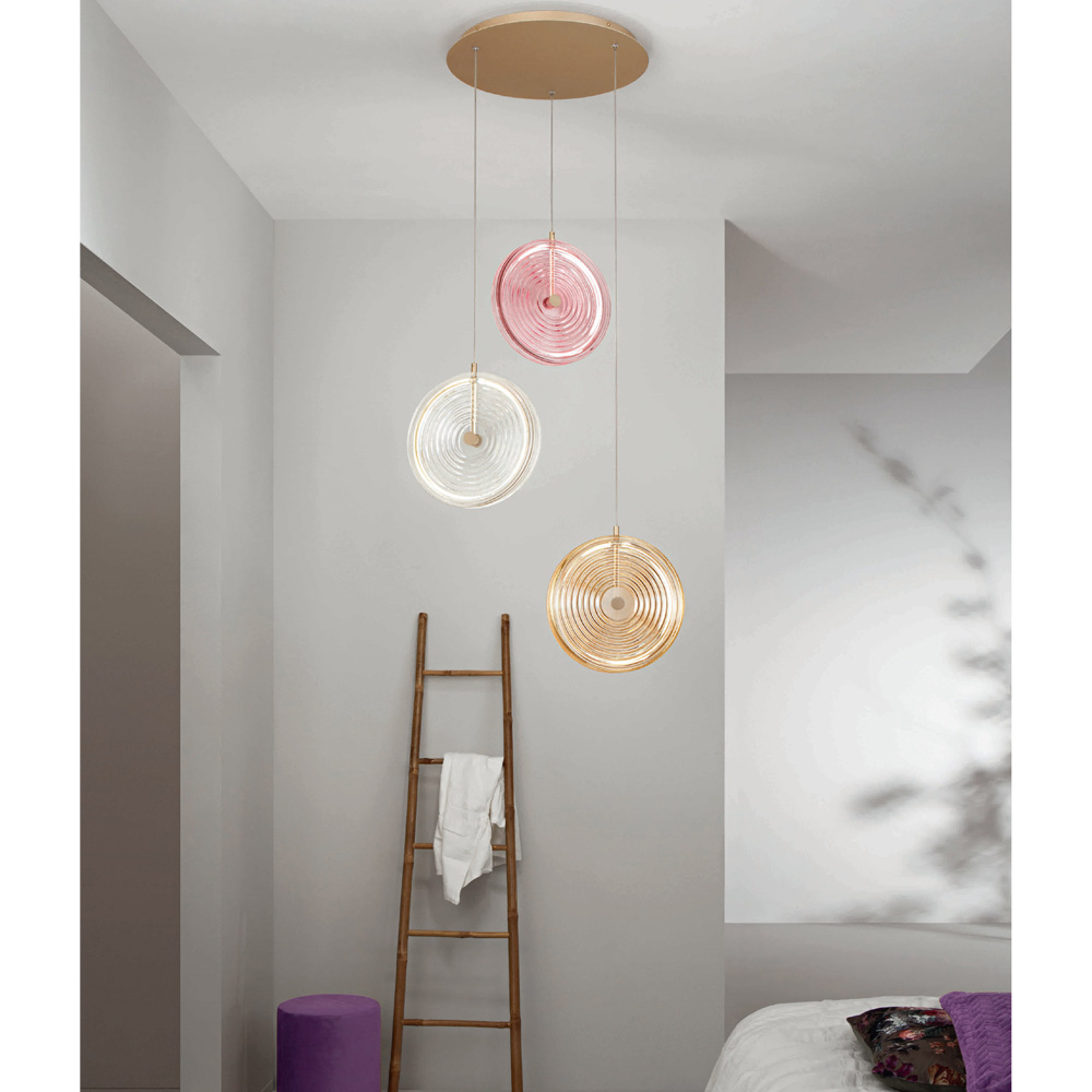 Lámpara de araña íntegramente fabricada en Italia realizada en metal pintado acabado dorado,cristal decorado con líneas concéntricas de color ámbar, rosa y transparente con luz LED regulable y cable regulable en longitud. Este producto tiene como objetivo realzar la tradición a través de un enfoque contemporáneo donde el estilo, la clase y la innovación se fusionan para crear nuevas fórmulas de diseño para amueblar e iluminar cualquier ambiente con gusto y carácter. Los puntos fuertes son la peculiaridad de las formas , la calidad de los materiales y la singularidad de la fuente de luz .