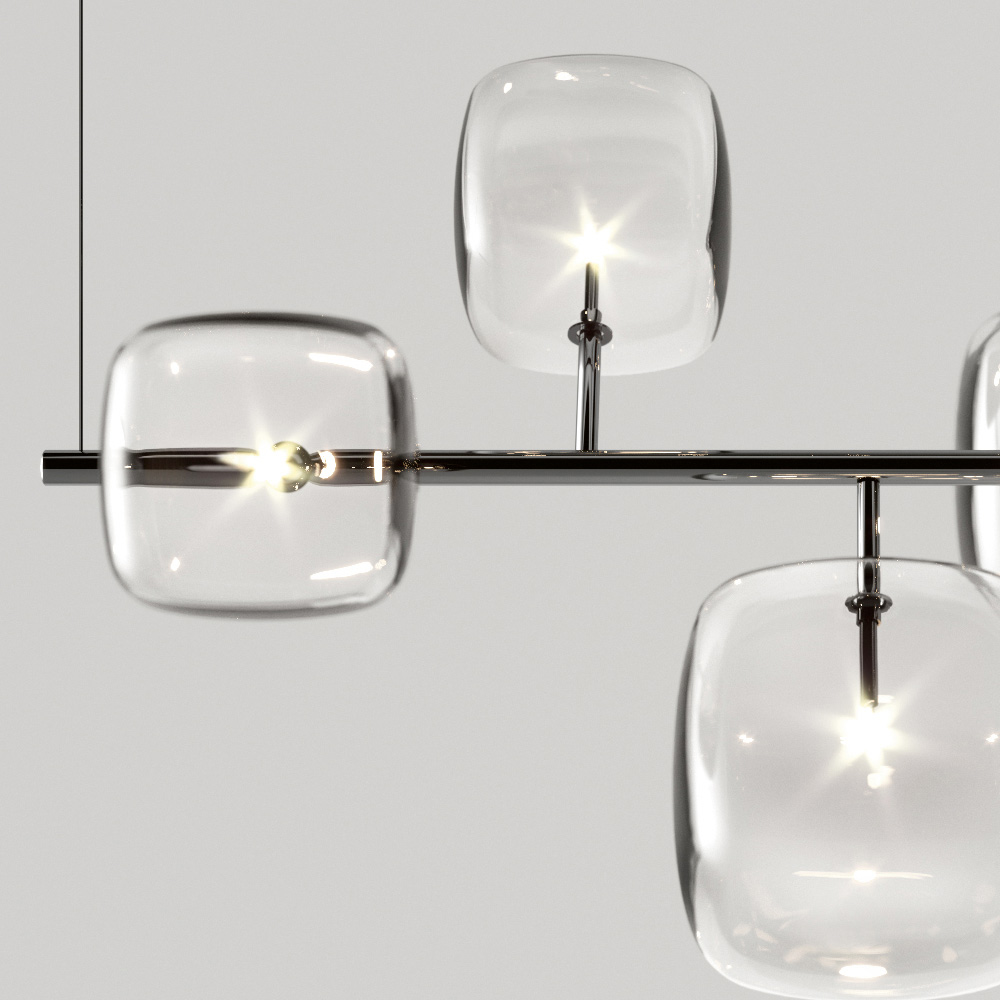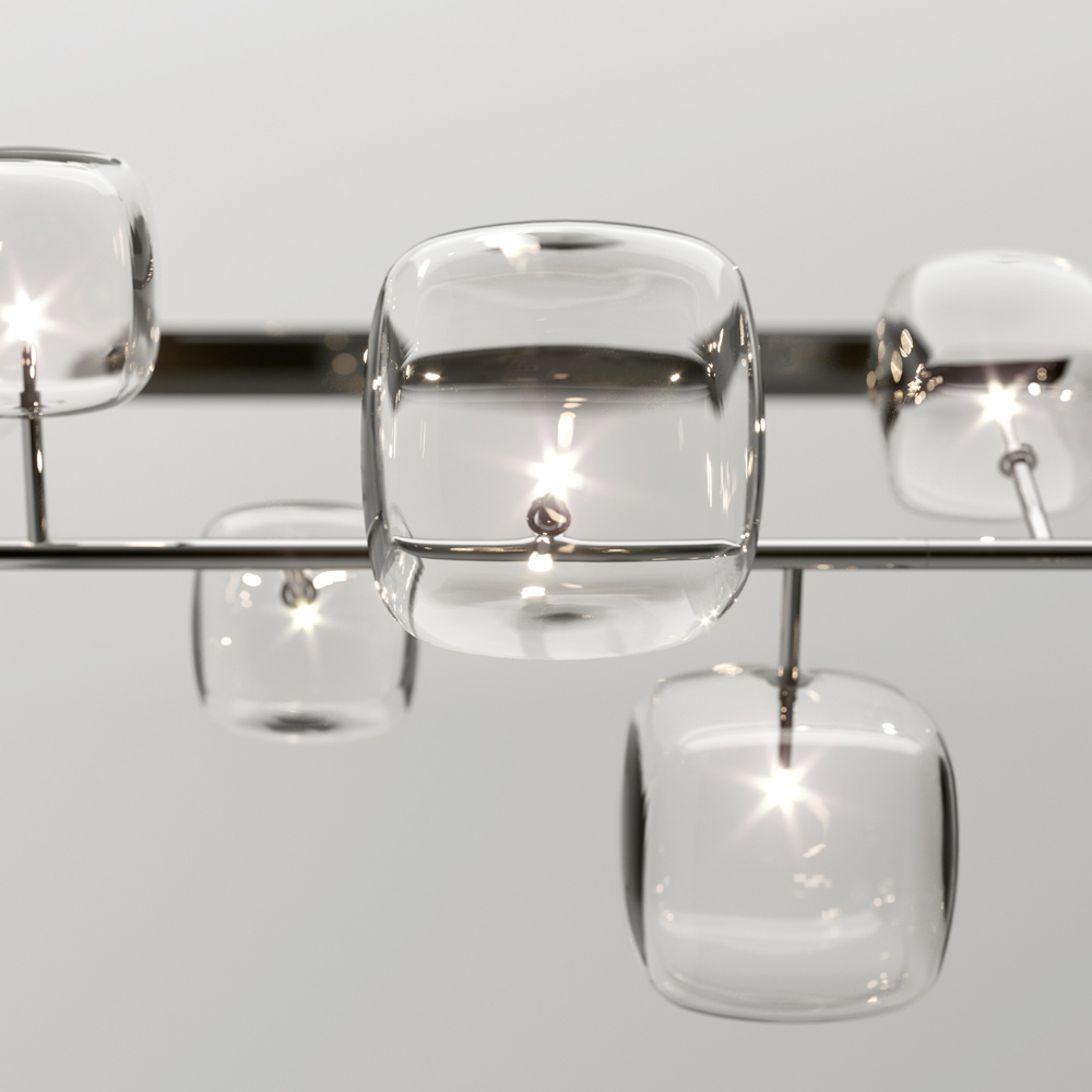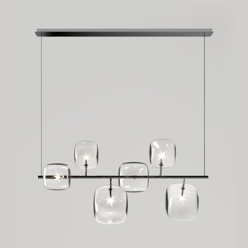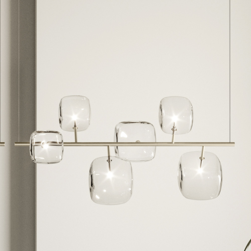 Lámpara colgante horizontal con estructura metálica y 6 estructuras cúbicas y redondeadas de cristal Pyrex soplado transparente con 1 bombilla LED regulable G4 3000K en el interior de cada una.