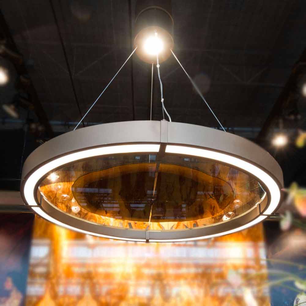 Araña modernacon estructura de acero acabado bronce con forma circular en cuyo interior encontramos una placa de vidrio acoplada rematada con un inserto en madera de nogal canaletto . Hecho en Italia mediante el uso de materias primas de calidad, este complemento ofrece una idea original y cautivadora de iluminación que encarna la elegancia y la contemporaneidad. Su peculiaridad está representada por la maravillosa combinación de colores y acabados seleccionados que dan vida a una verdadera obra de arte capaz de revolucionar cualquier espacio de la casa gracias al encuentro entre la modernidad del metal, la elegancia atemporal del vidrio y los maravillosos colores del madera y su veta. La forma y dimensiones que subrayan su estética lo convierten en una solución perfecta para iluminar grandes espacios como comedores o salones donde completa el mobiliario con un toque refinado e innovador, al tiempo que crea un espléndido ambiente cálido y acogedor .