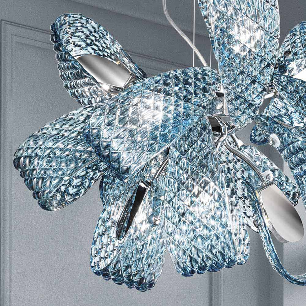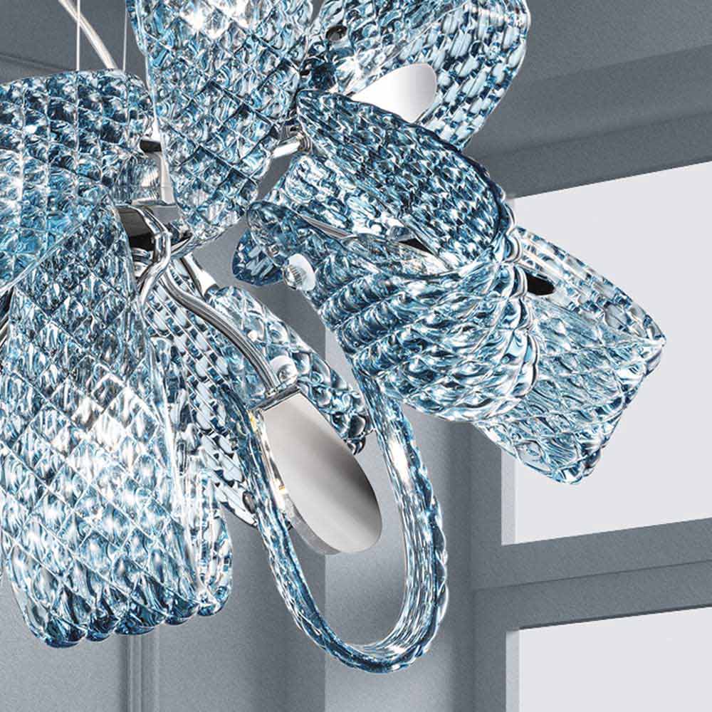 Araña de 9 luces hecha a mano en Italia en Venecia con estructura de vidrio acabado azul y detalles en metal cromado pulido. Una idea de iluminación compuesta por voluptuosas cintas y texturas inusuales que le dan su originalidad estética y una sensación de dinamismo . Gracias a su diseño excéntrico y refinado y a las inserciones metálicas que contrastan con el vidrio, nace una araña exclusiva , capaz de caracterizar cualquier ambiente con un toque de ligereza, dando vida a maravillosos juegos de luces .