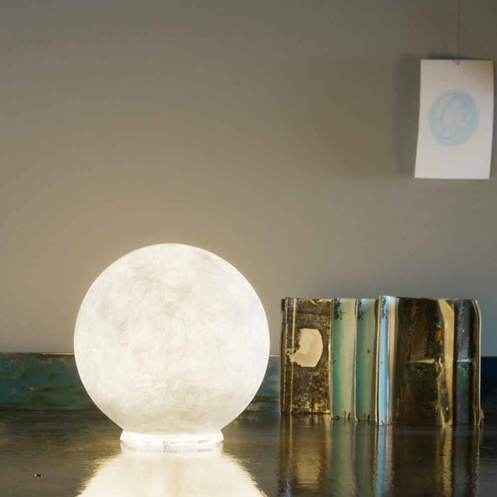 Lámpara de mesa de diseño en nebulita blanca In-es.artdesign T.moon T.moon es la lámpara de mesa ultramoderna de la colección Luna. Diseño en arte que puede reproducir la atmósfera mágica de la luna, gracias al innovador material con el que está hecho: el Nebulite® , un material compuesto de resina y fibra, cuyas venas le dan a la lámpara este particular efecto "lunar".