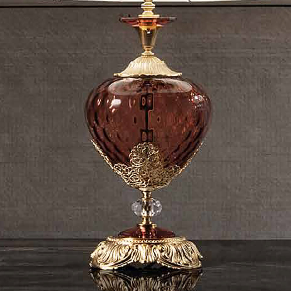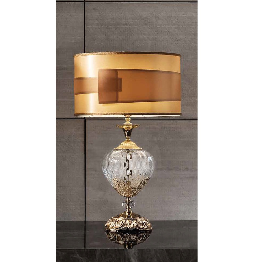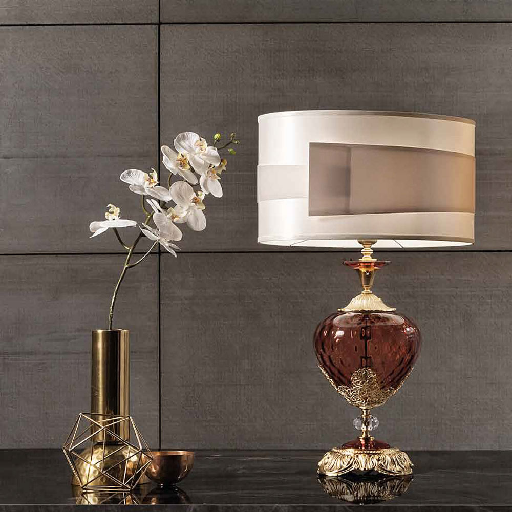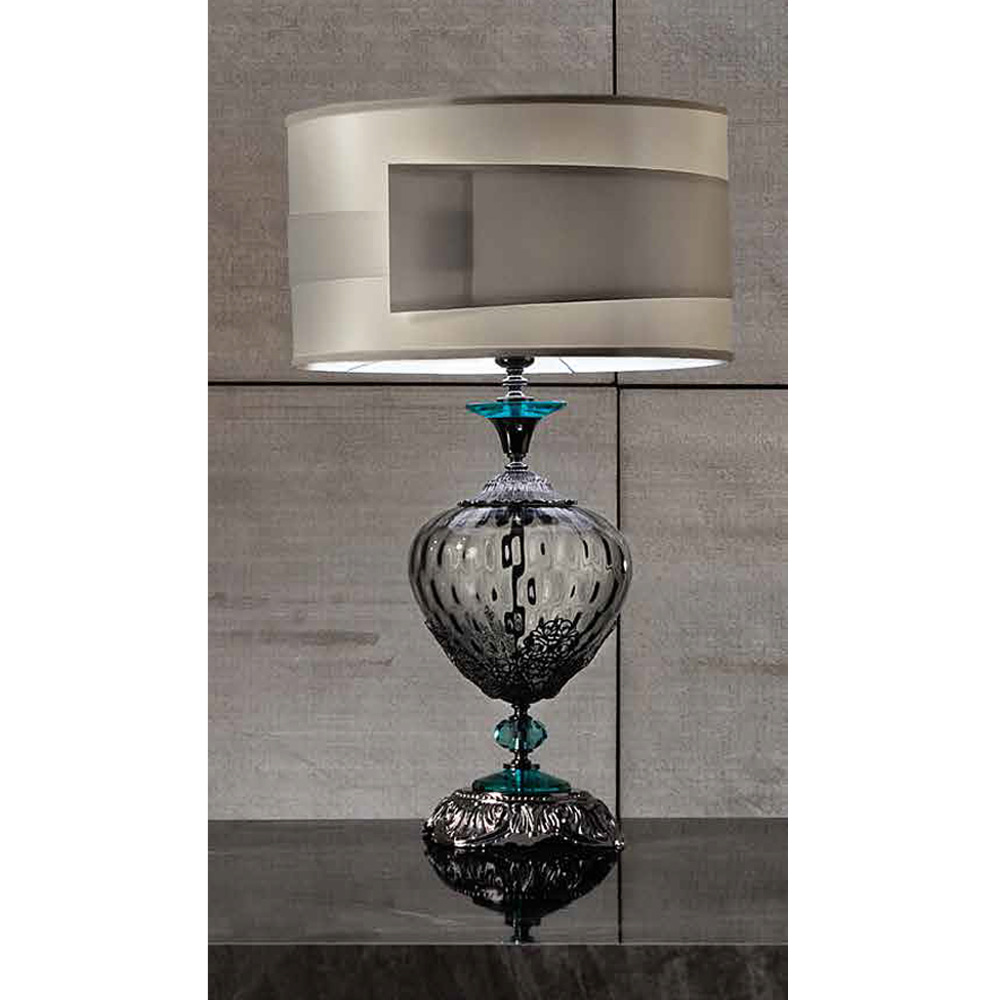 La lámpara de mesa con pantalla es un accesorio de iluminación de lujo totalmente fabricado en Italia en vidrio artesanal de la más alta calidad y se caracteriza por la particular sección ovalada de los brazos. Lo que lo hace único y majestuoso son los cristales engastados a mano y los detalles artesanales de filigrana metálica que dan vida a un estilo clásico del pasado, cuyo encanto se vuelve protagonista en el espacio de destino.