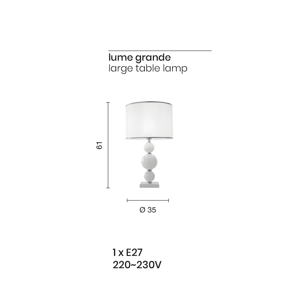 Ideal para quienes desean una iluminación escenográfica con un estilo antiguo, su lujoso diseño consiste en una base de vidrio hecha a mano con tres esferas de vidrio colocadas una encima de la otra para sostener la pantalla de tela de forma redonda. Núcleo y detalles en metal cromado.