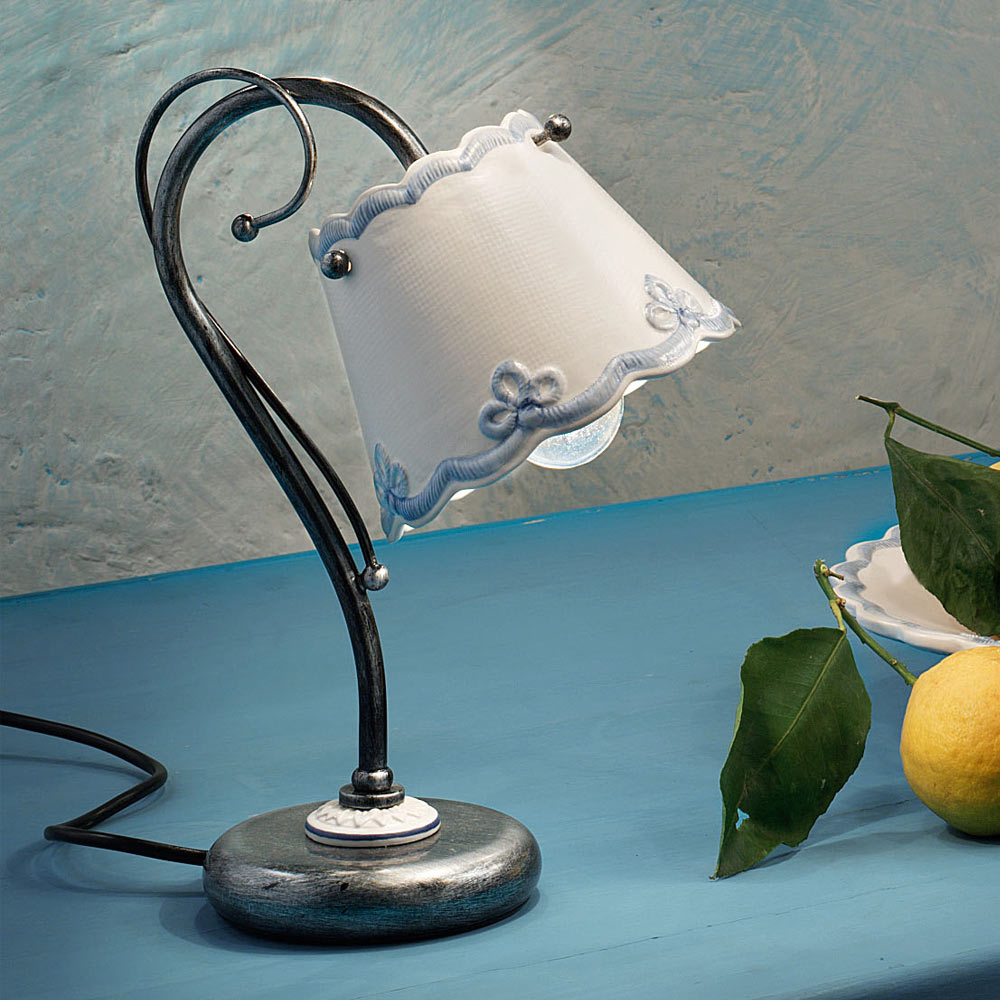 Esta lámpara de mesaestá completamente hecho a mano en metal y cerámica pintada a mano,para resaltar la artesanía y las habilidades manuales de los artesanos. El diseño se caracteriza por laremiten a los bordados de los kitsdel pasado presente en la forma de la cerámica y en los detalles de los marcos.