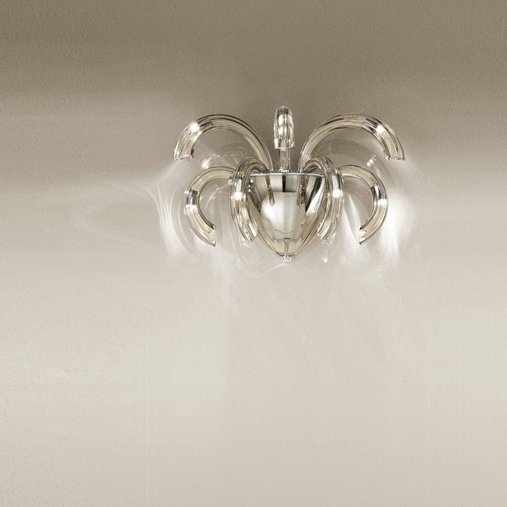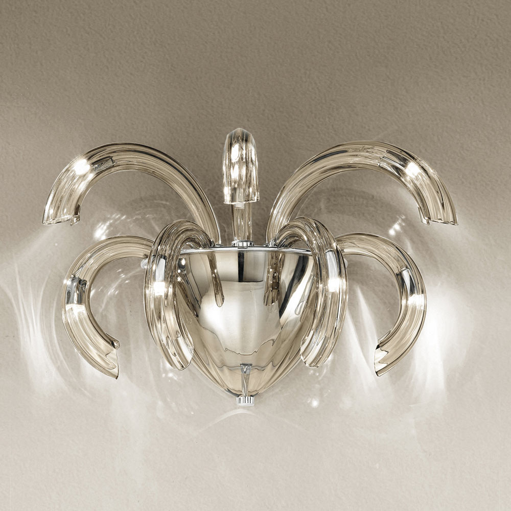 Aplique de pared fabricado artesanalmente en Italia en cristal veneciano acabado ahumado con detalles en metal cromado . Una estética envolvente que se adapta a cualquier tipo de ambiente en el que encaje con exuberancia gracias a sus formas y la funcionalidad de su diseño. Los maravillosos y elegantes brazos curvos se expanden hacia el exterior para llevar la luz en varias direcciones e iluminar la habitación a través de un original efecto escenográfico que recuerda la explosión de los fuegos artificiales para un resultado creativo , refinado y de fuerte impacto visual .