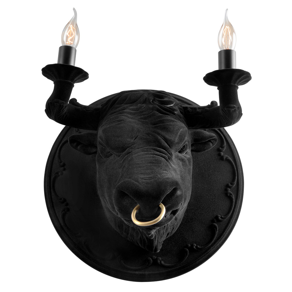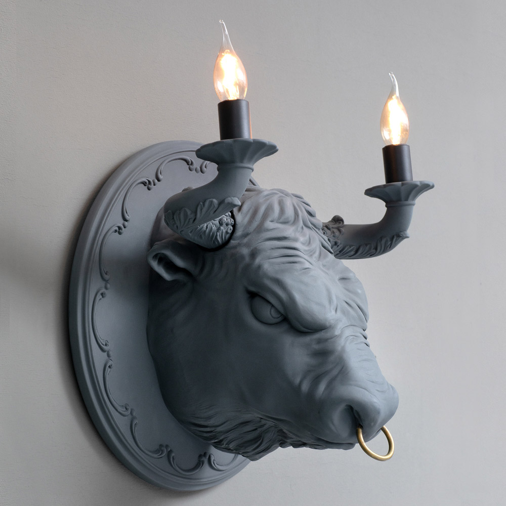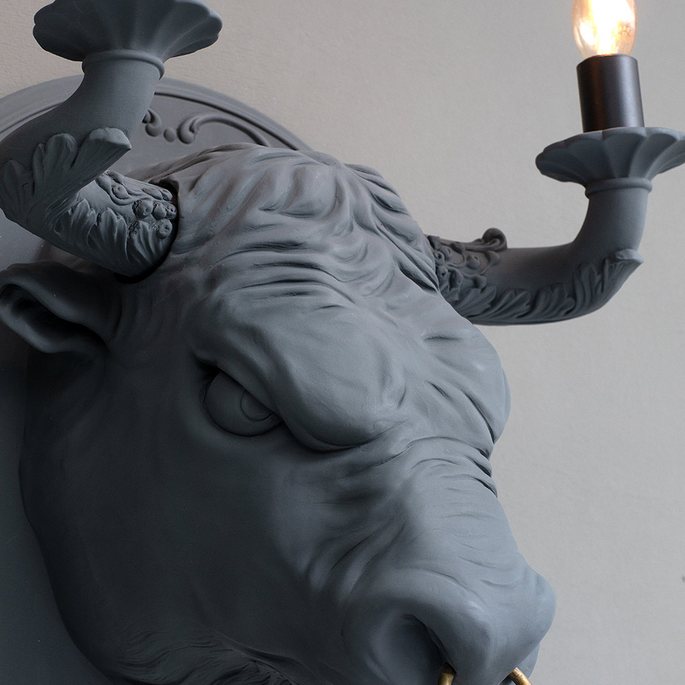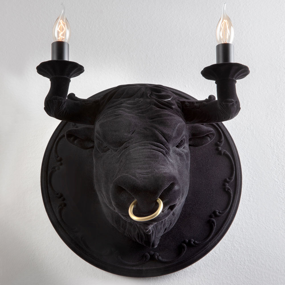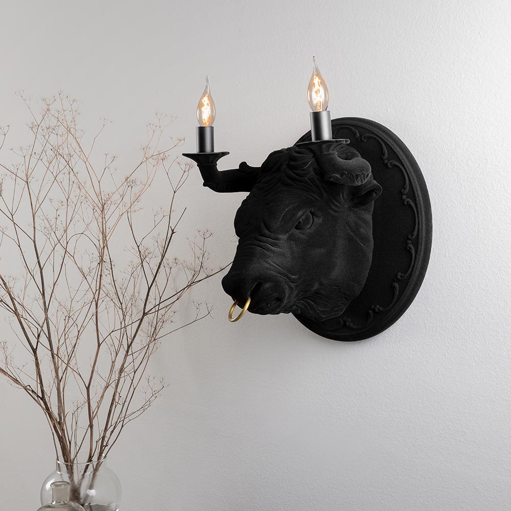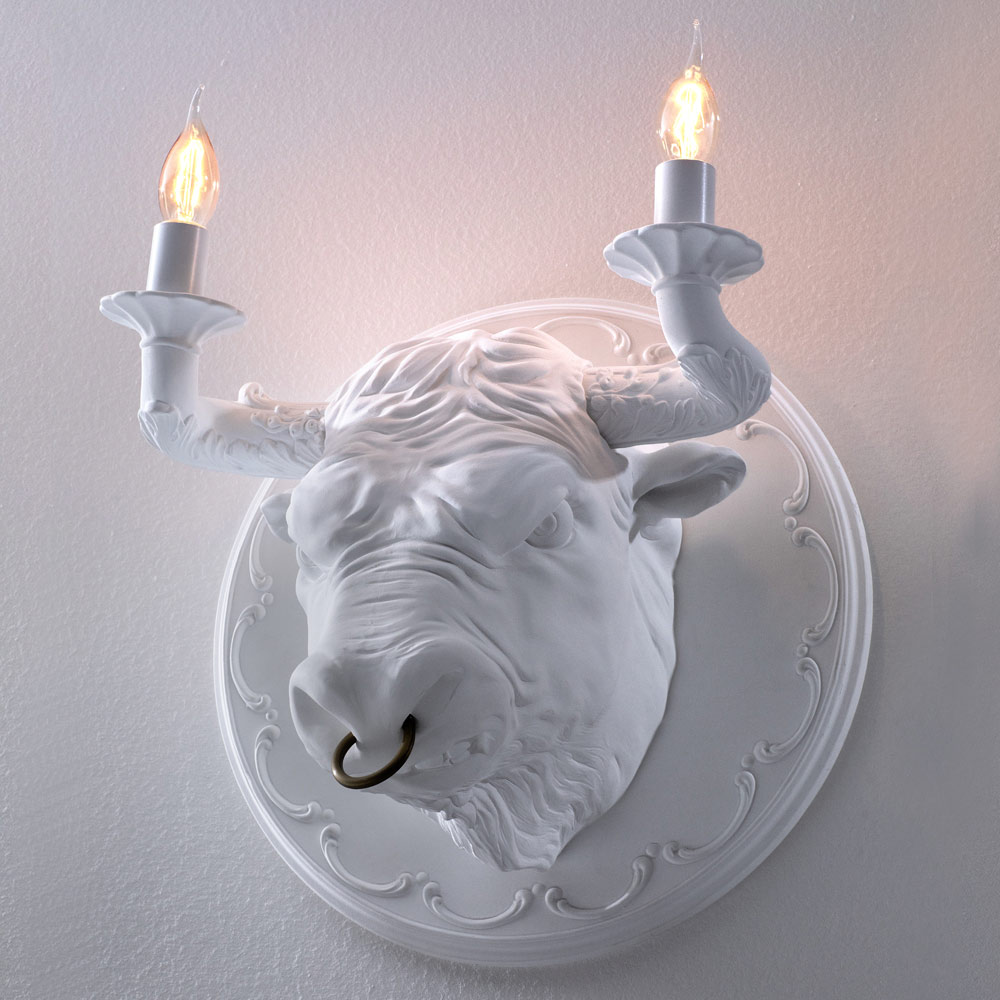 Esta lámpara de pared original y única tiene un diseño moderno y lindo en forma de cabeza de toro con nariz y cuernos para luces, para un espíritu ligero y sofisticado.