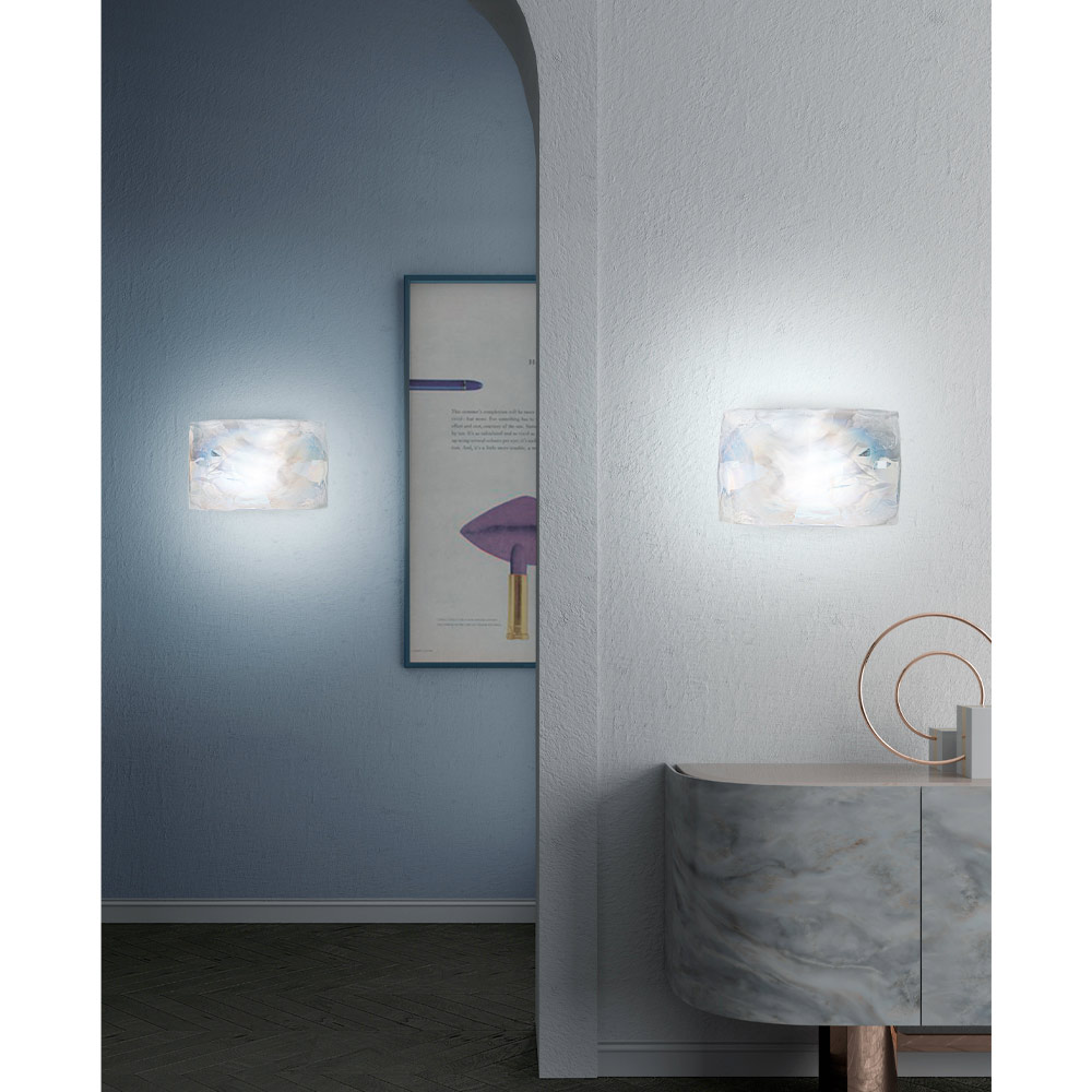 Aplique de pared realizado artesanalmente en vidrio soplado dentro de los hornos del interior veneciano, en Italia, gracias a la transmisión de técnicas ancestrales utilizadas a lo largo de los años por los maestros del vidrio italianos para el procesamiento del vidrio de Murano.
