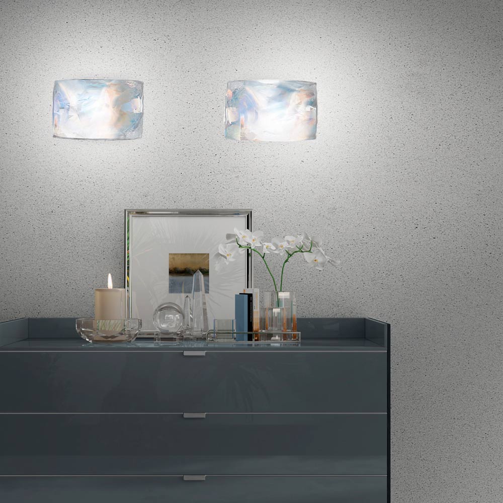 Una pequeña obra de arte con una estética intrigante realizada en placa de vidrio blanco rayado con decoración de iris (efecto nácar) que le da al ambiente un toque de refinada elegancia gracias a la textura particular y al efecto visual inédito creado por el vidrio para una resultado con gran personalidad.