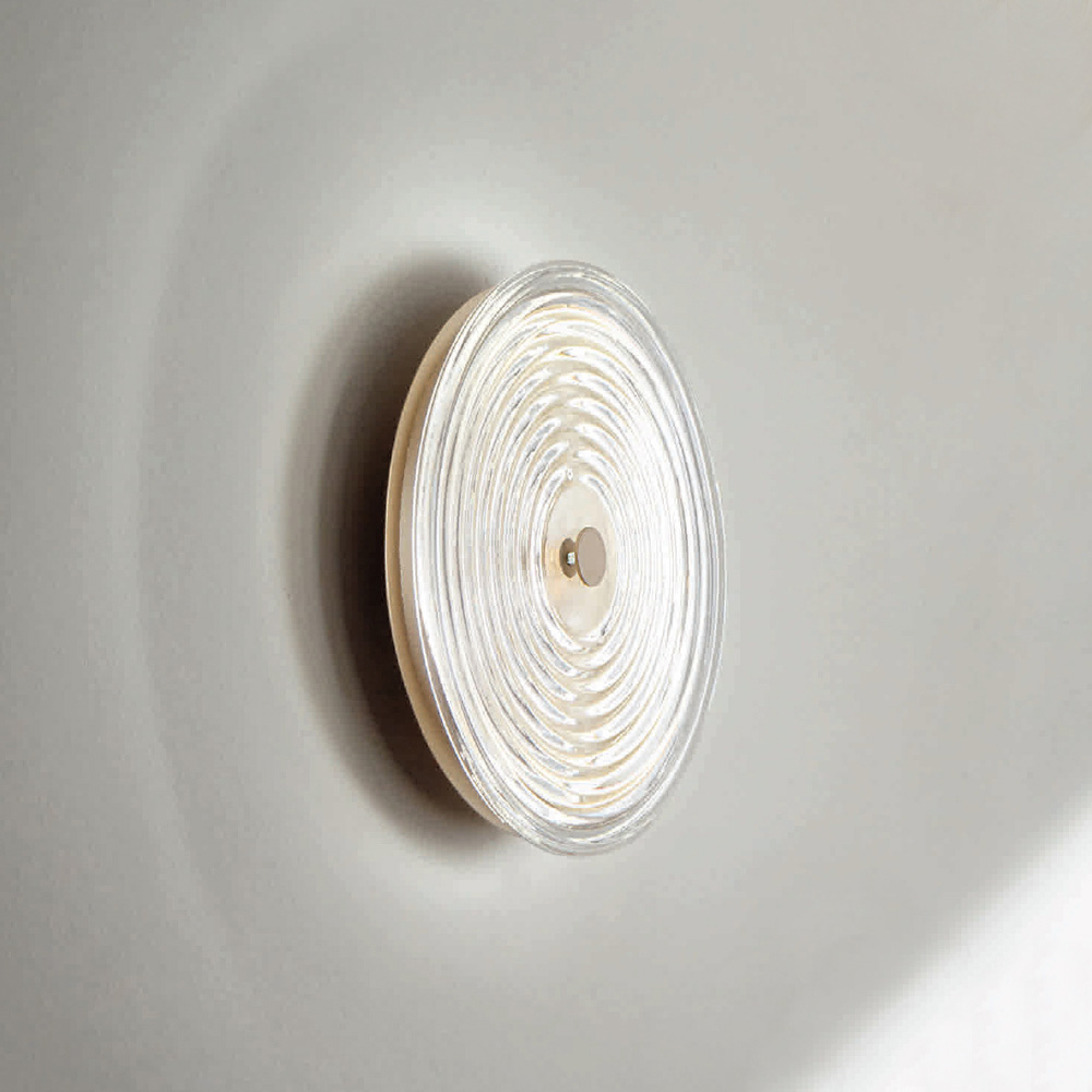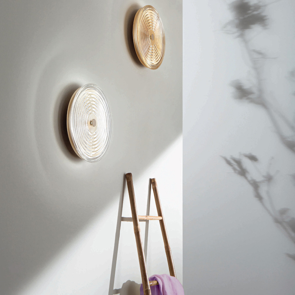 Aplique de pared íntegramente producido en Italia realizado en metal pintado acabado oro,cristal decorado con líneas concéntricas con luz LED . Este producto tiene como objetivo realzar la tradición a través de un enfoque contemporáneo donde el estilo, la clase y la innovación se fusionan para crear nuevas fórmulas de diseño para amueblar e iluminar cualquier ambiente con gusto y carácter. Los puntos fuertes son la peculiaridad de las formas , la calidad de los materiales y la singularidad de la fuente de luz .