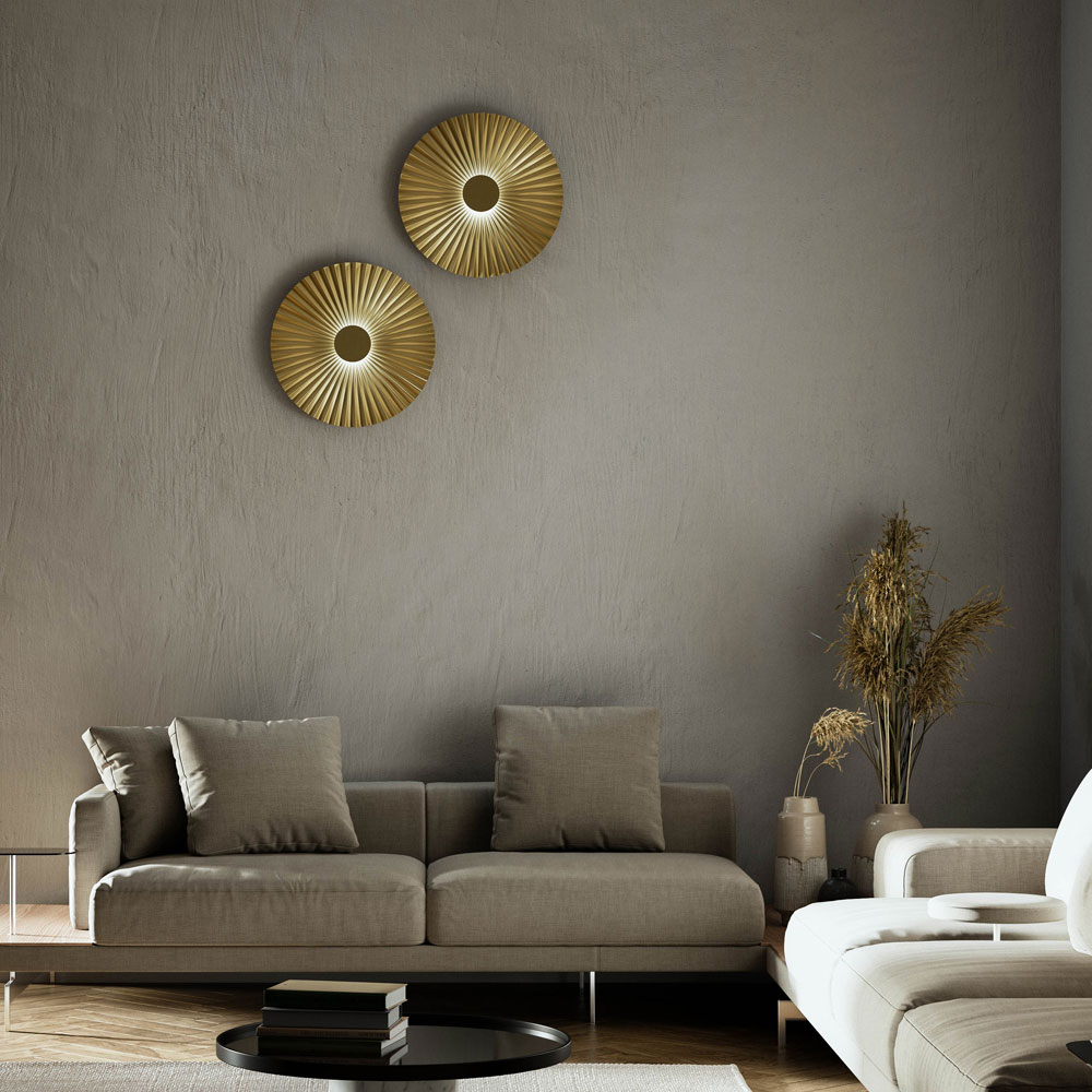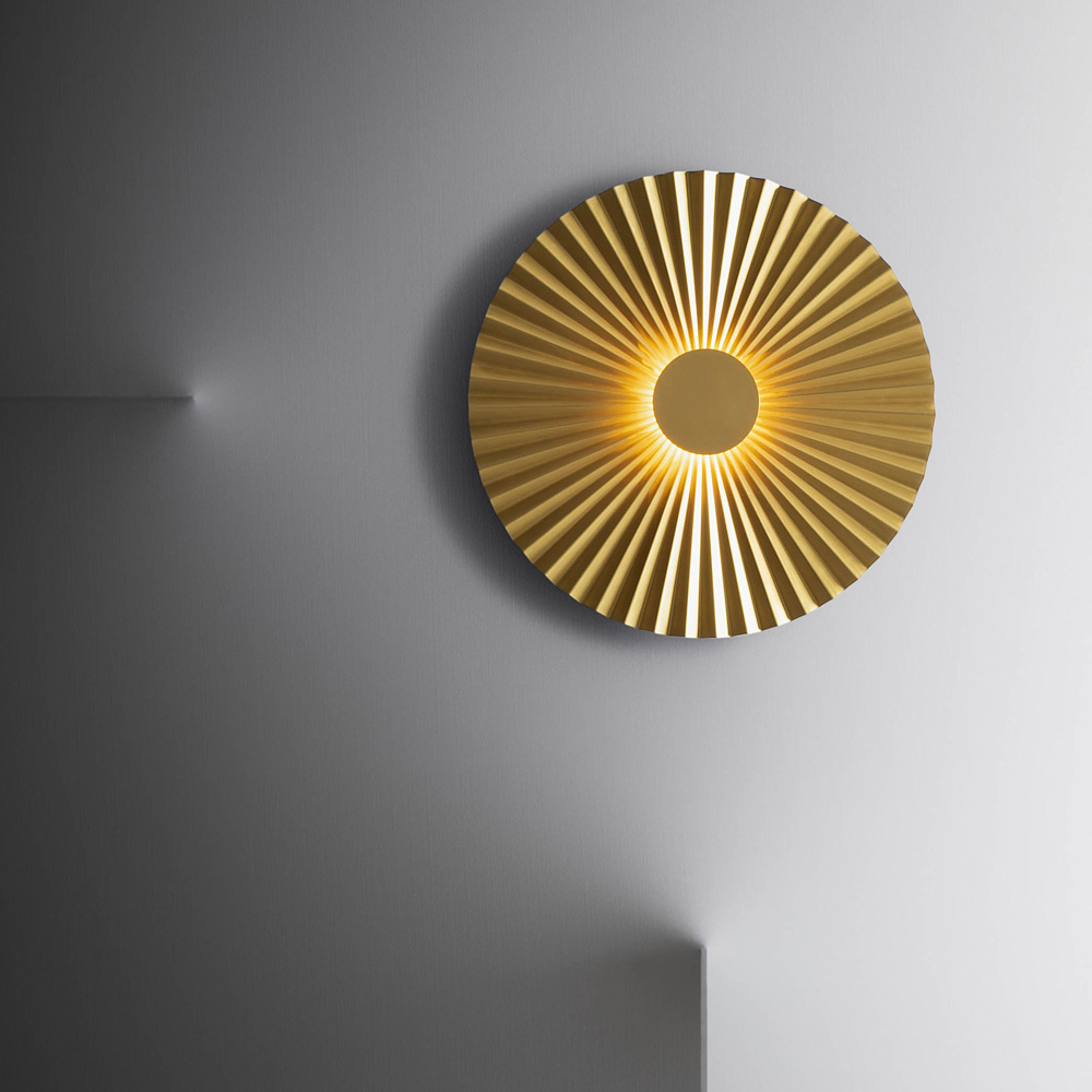 Esta lámpara de pared es una reinterpretación moderna del difusor cerámico cónico tradicional con un elegante efecto plisado. El producto ha sido revisado y reproducido en latón natural pulido integrando también una fuente LED. El resultado es un mueble romántico , que se puede utilizar individualmente o en grupo, con un elegante encanto que recuerda a la falda acampanada de los elegantes vestidos femeninos típicos de los años 50.