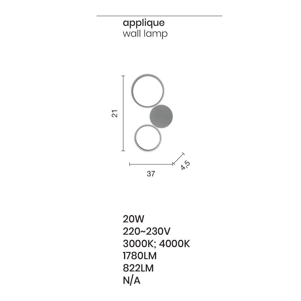 Lámpara de pared con estructuraen metal pintado dorado con fuente LED regulable.Elegancia y originalidad se unen en una composición moderna formada por tres círculos de diferentes tamaños unidos entre sí y cubiertos en el exterior por un difusor blanco lechoso que encierra la tira de LED, creando maravillosos efectos de luz en las paredes para un resultado de fuerte efecto escenográfico. . Gracias a su personalidad creativa y su alma moderna podrá ofrecer al mismo tiempo una iluminación de calidad y un elemento decorativo único capaz de enriquecer las paredes de la casa con un toque exclusivo . Un mueble con carácter versátil , que se puede instalar en cualquier ambiente doméstico como la entrada, la cocina, el salón o el dormitorio.