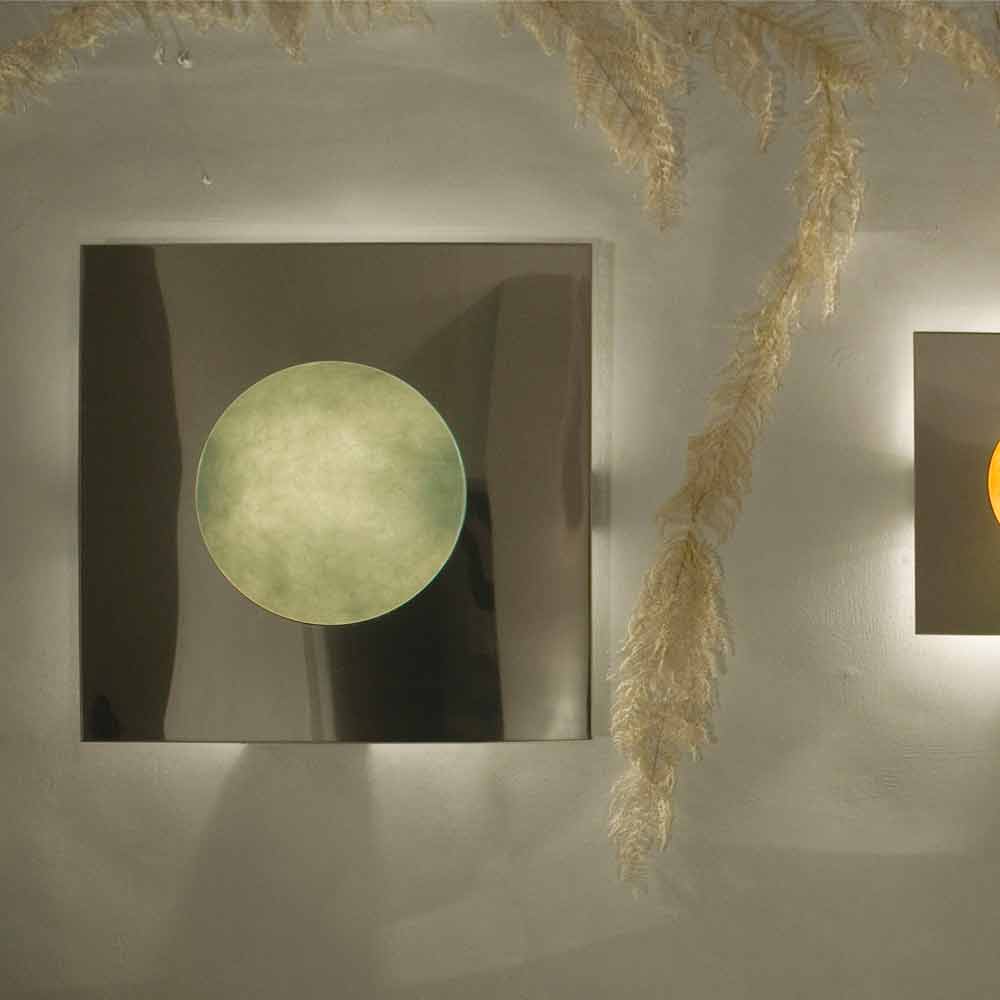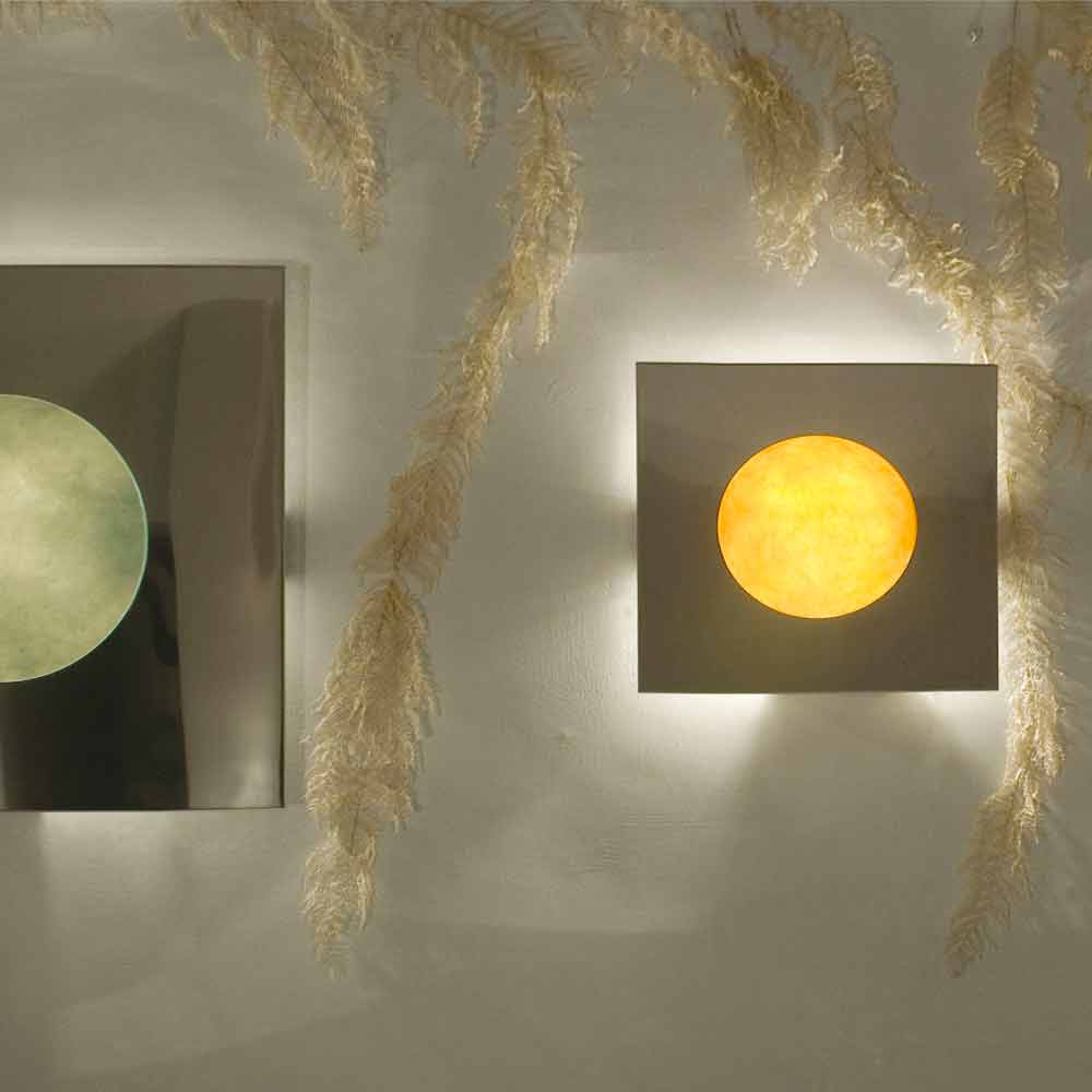 Una verdadera obra de arte, hecha de acero pulido y nebulita, un material compuesto de resina y fibra cuyas venas dan a la lámpara un efecto lunar particular. Disponible en dos tamaños diferentes y en seis colores diferentes: colores: - blanco - rojo - naranja - turquesa - magenta - azul