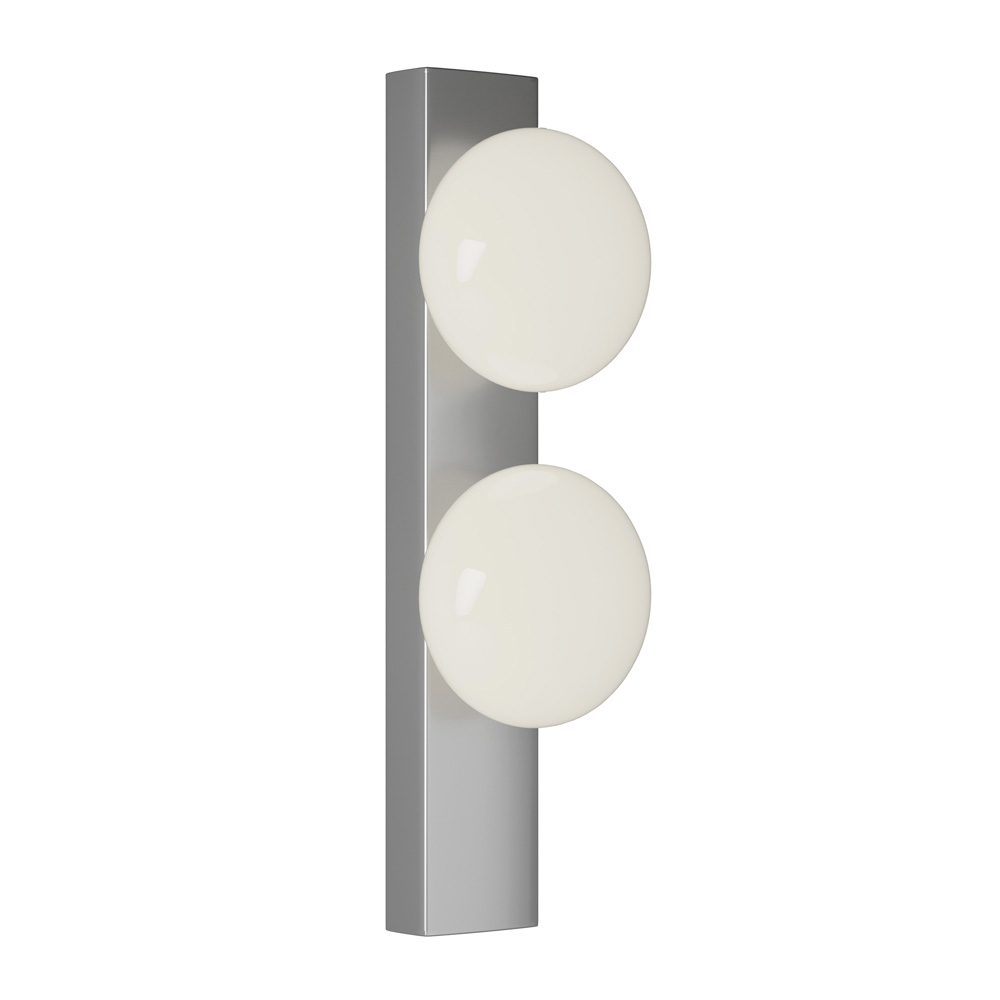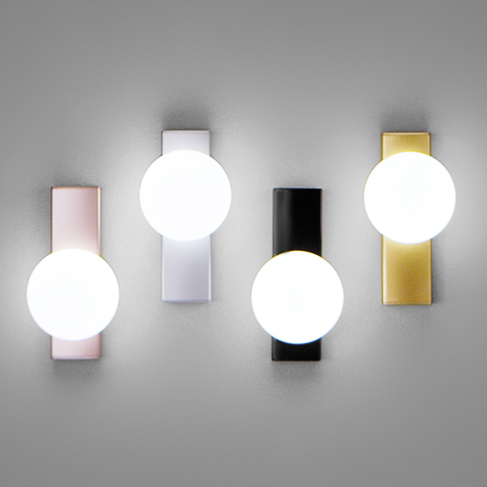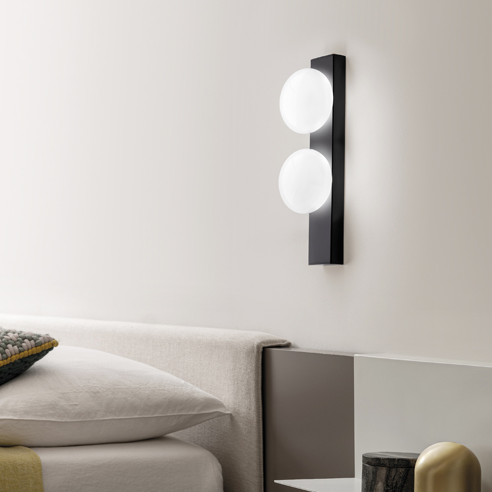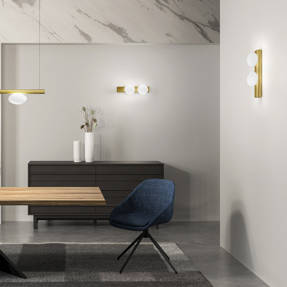 Este aplique es la fusión perfecta de diseño geométrico y minimalismo refinado . La composición esencial se ve realzada por una o dos esferas luminosas de vidrio opalino que difunden una luz suave y acogedora , ideal para crear ambientes relajantes y sofisticados.