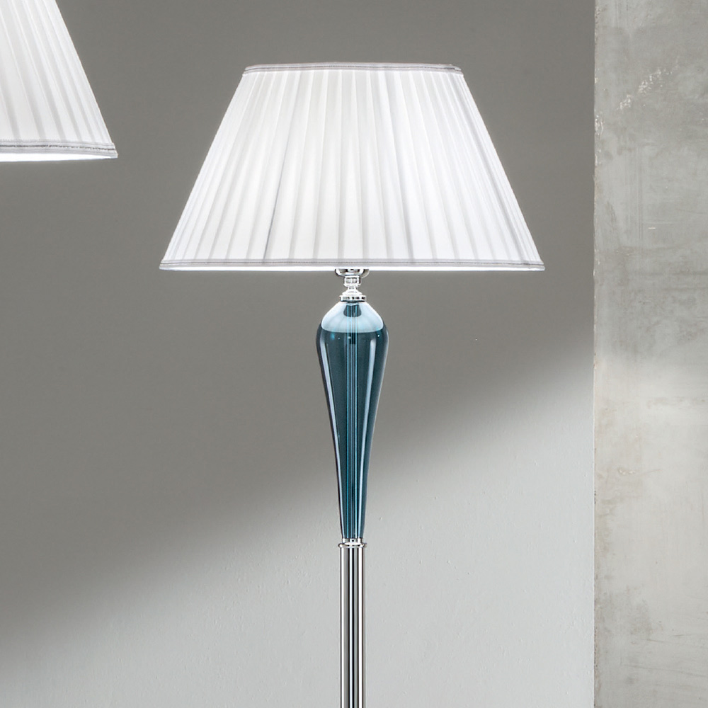 Esta lámpara de pie está compuesta por una base de forma redonda en metal cromado adornada con motivos de vidrio transparente coloreado.