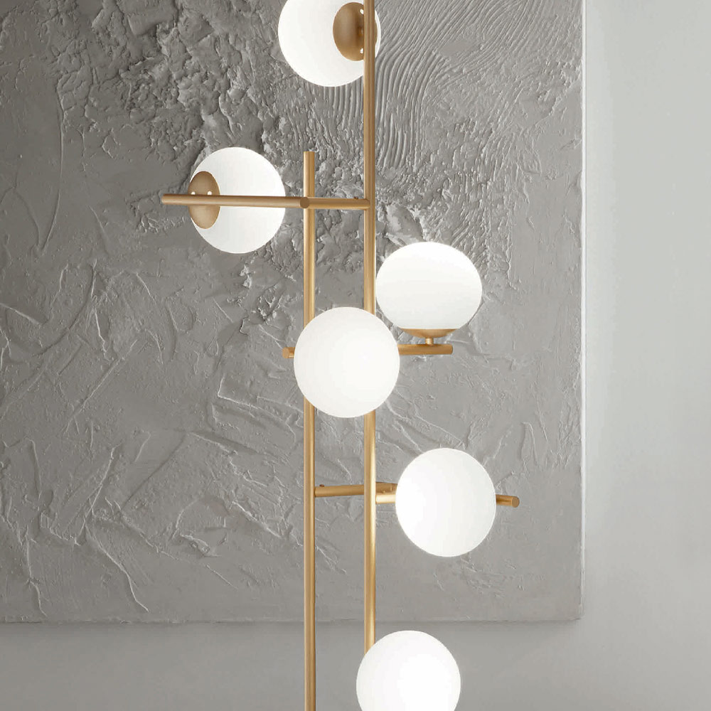 Lámpara de pie íntegramente producida en Italia realizada en metal pintado y cristal soplado dorado con luz LED. Este producto tiene como objetivo realzar la tradición a través de un enfoque contemporáneo donde el estilo, la clase y la innovación se fusionan para crear nuevas fórmulas de diseño para amueblar e iluminar cualquier ambiente con gusto y carácter. Los puntos fuertes son la peculiaridad de las formas , la calidad de los materiales y la singularidad de la fuente de luz .