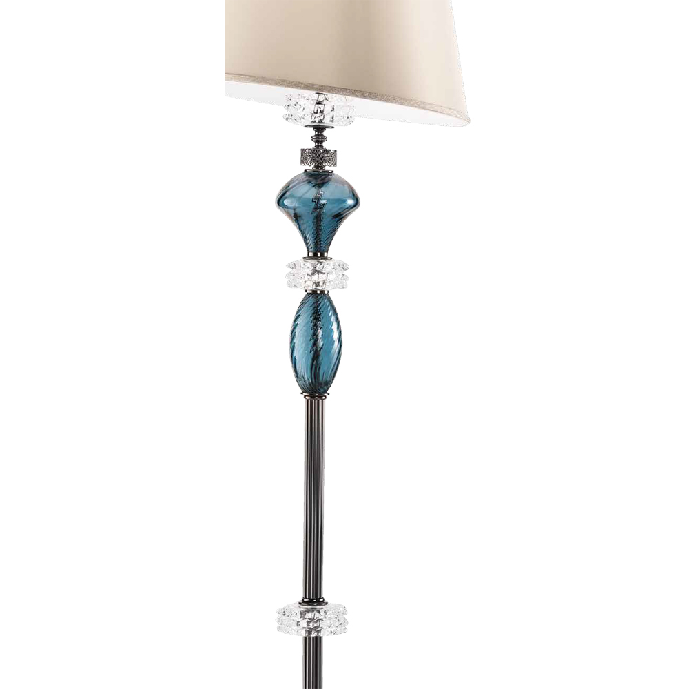 La lámpara de pie con pantalla es un accesorio de iluminación de lujofabricado íntegramente en Italia en vidrio artesanal de la más alta calidad. Lo que lo hace único y majestuoso son los detalles y acabados metálicos que dan vida a un estilo clásico de antaño, cuyo encanto se vuelve protagonista en el espacio de destino.