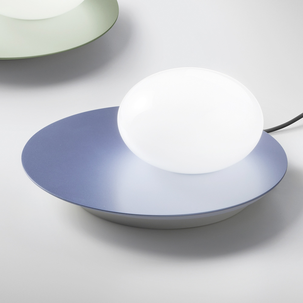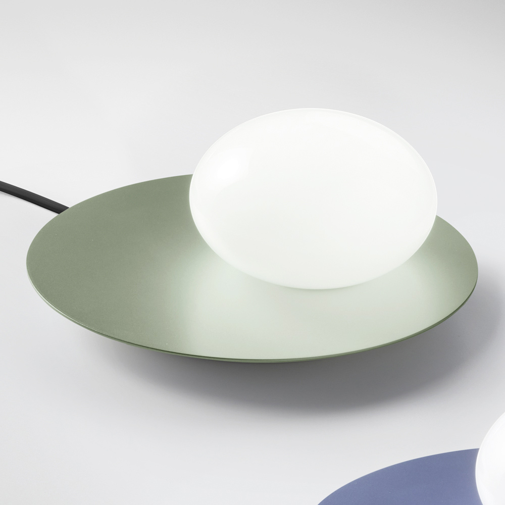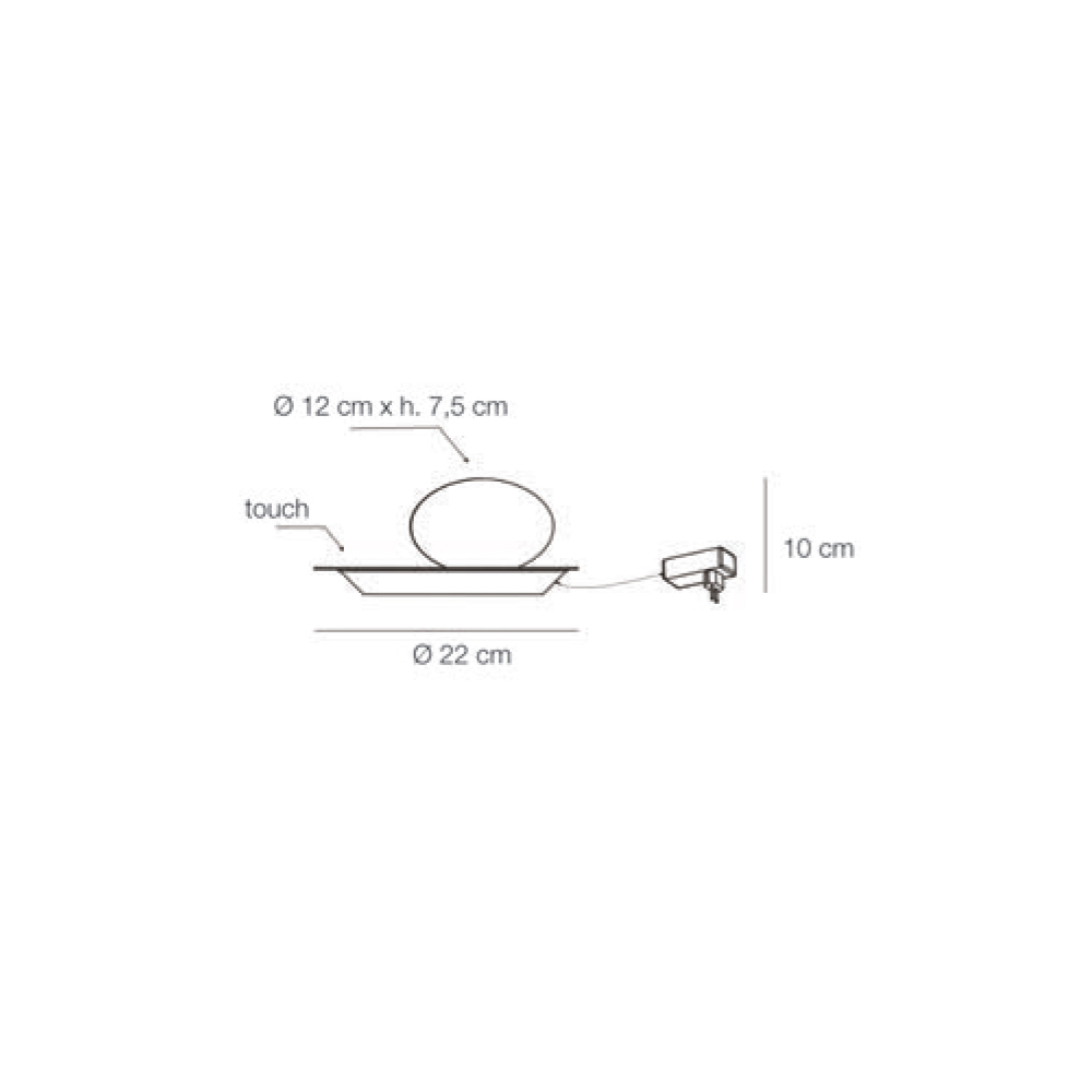 Lámpara de interior fabricada con estructura de aluminio reciclable, rosetón metálico y pantalla de vidrio soplado blanco lechoso. La lámpara es regulable mediante un sensor táctil en el rosetón.