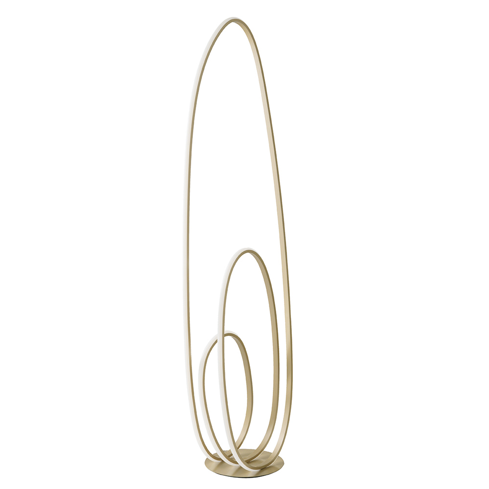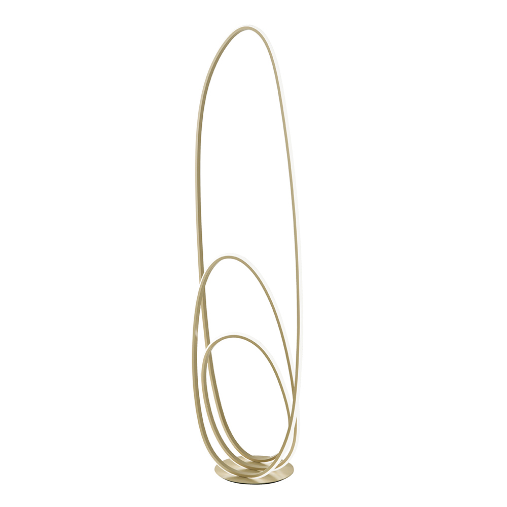 Lámpara de pie moderna fabricada en metal pintado acabado doradocon fuente LED integrada regulable. Una lámpara de pie con un diseño moderno y cautivador concebida para amueblar e iluminar cualquier espacio doméstico con un toque original y refinado . Su estructura se desarrolla en un vórtice vertical compuesto por una línea continua que recrea círculos elípticos dando vida a un complemento de estilo particularmente refinado y exclusivo. Capaz de brindar una iluminación de calidad a través de una luz cálida y acogedora , esta lámpara demuestra al mismo tiempo un excelente elemento decorativo perfecto para quienes aman enriquecer su hogar con objetos de diseño exclusivos.