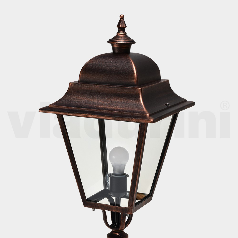 Lámpara de exterior con estructura de aluminio inyectado y difusor de cristal transparente íntegramente fabricada en Italia . Ideal para completar con elegancia y cuidado cualquier ambiente exterior como porches, avenidas, paseos, pero también jardines y zonas contract como bares y restaurantes al aire libre, este mueble se caracteriza por una personalidad antigua y refinada y un fuerte lado funcional que permite obtener una iluminación de calidad .