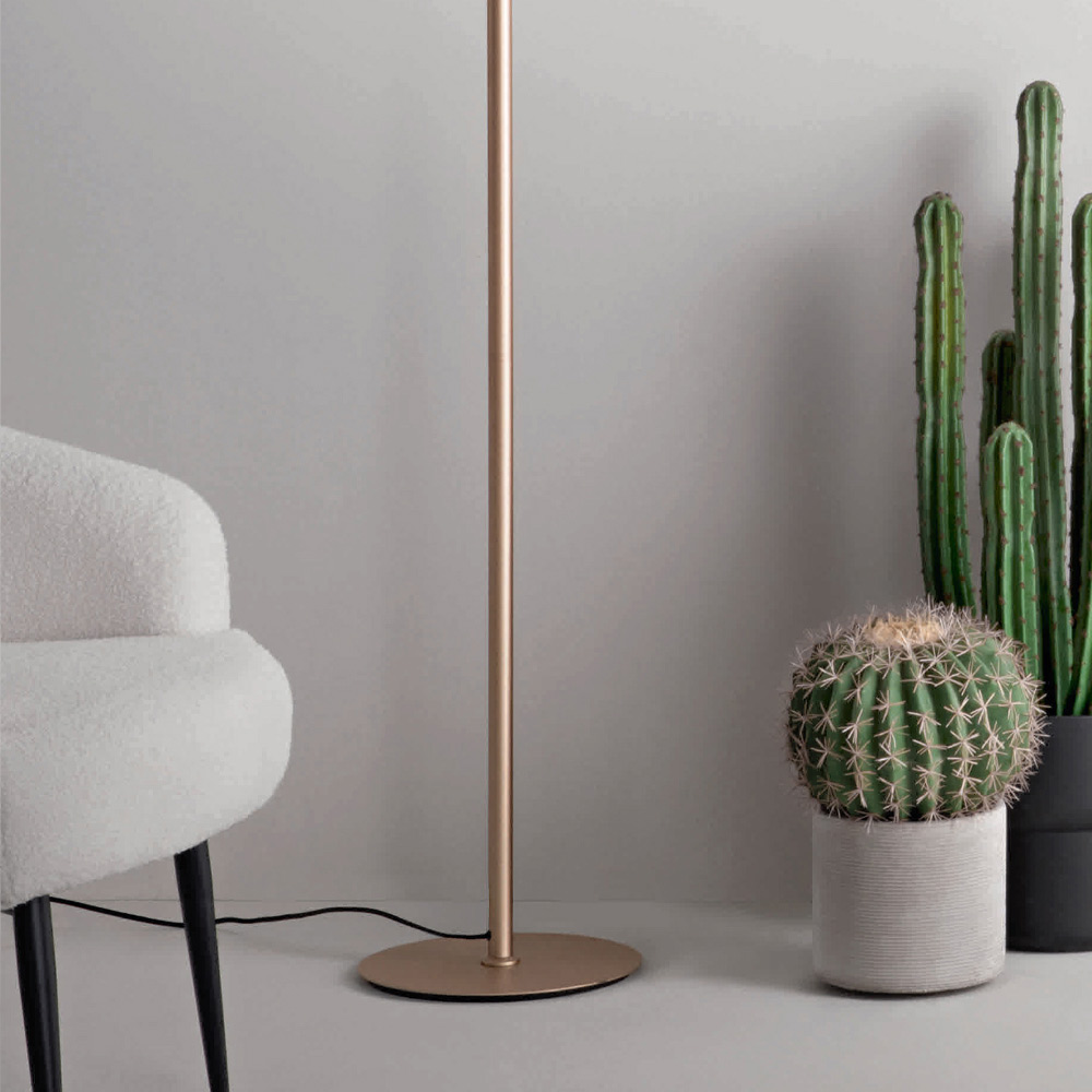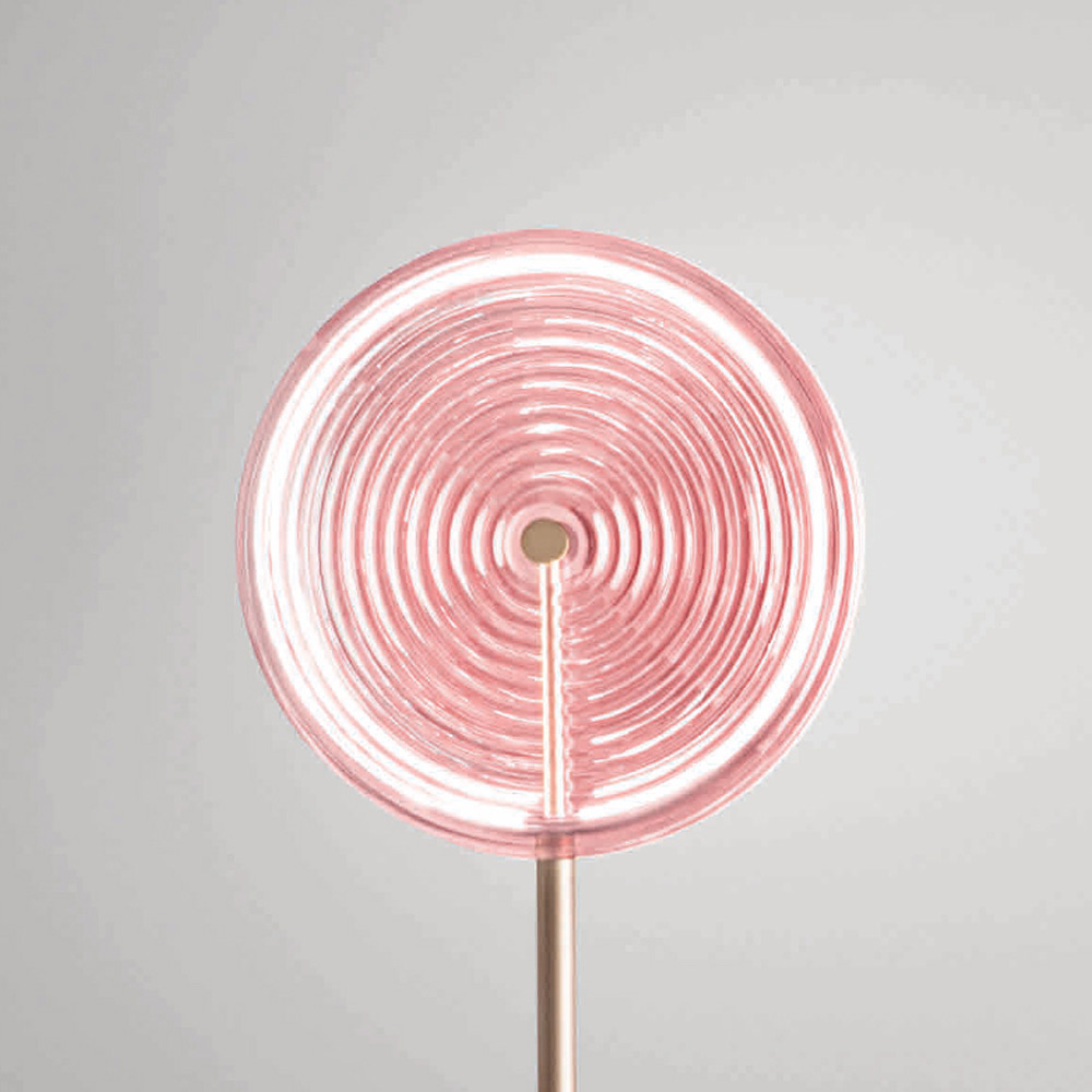 Lámpara de pie íntegramente producida en Italia realizada en metal pintado acabado dorado,cristal decorado con líneas concéntricas rosas con luz LED regulable . Este producto tiene como objetivo realzar la tradición a través de un enfoque contemporáneo donde el estilo, la clase y la innovación se fusionan para crear nuevas fórmulas de diseño para amueblar e iluminar cualquier ambiente con gusto y carácter. Los puntos fuertes son la peculiaridad de las formas , la calidad de los materiales y la singularidad de la fuente de luz .