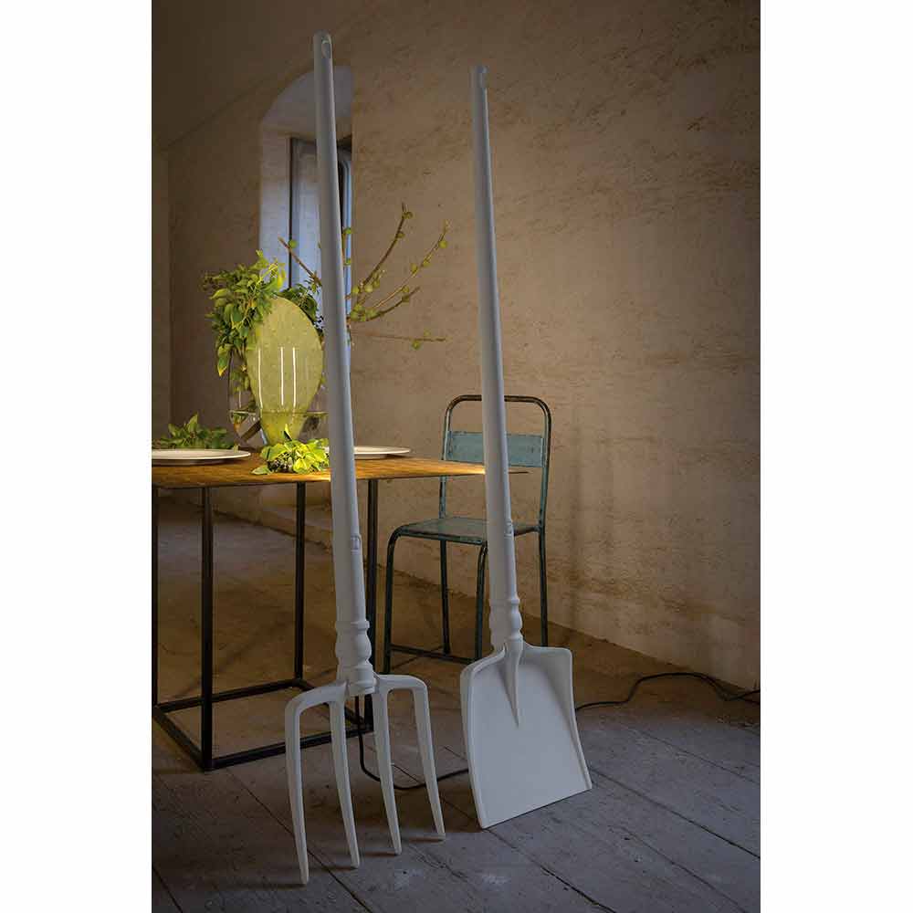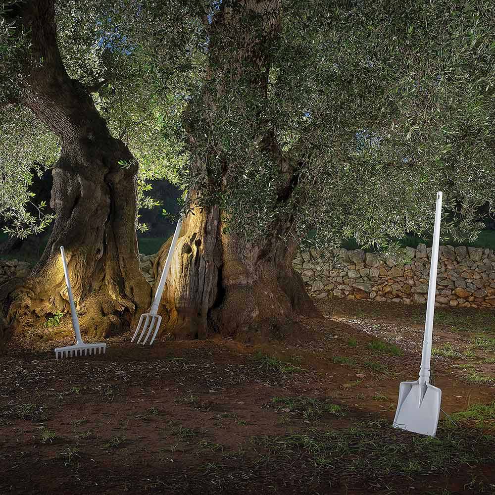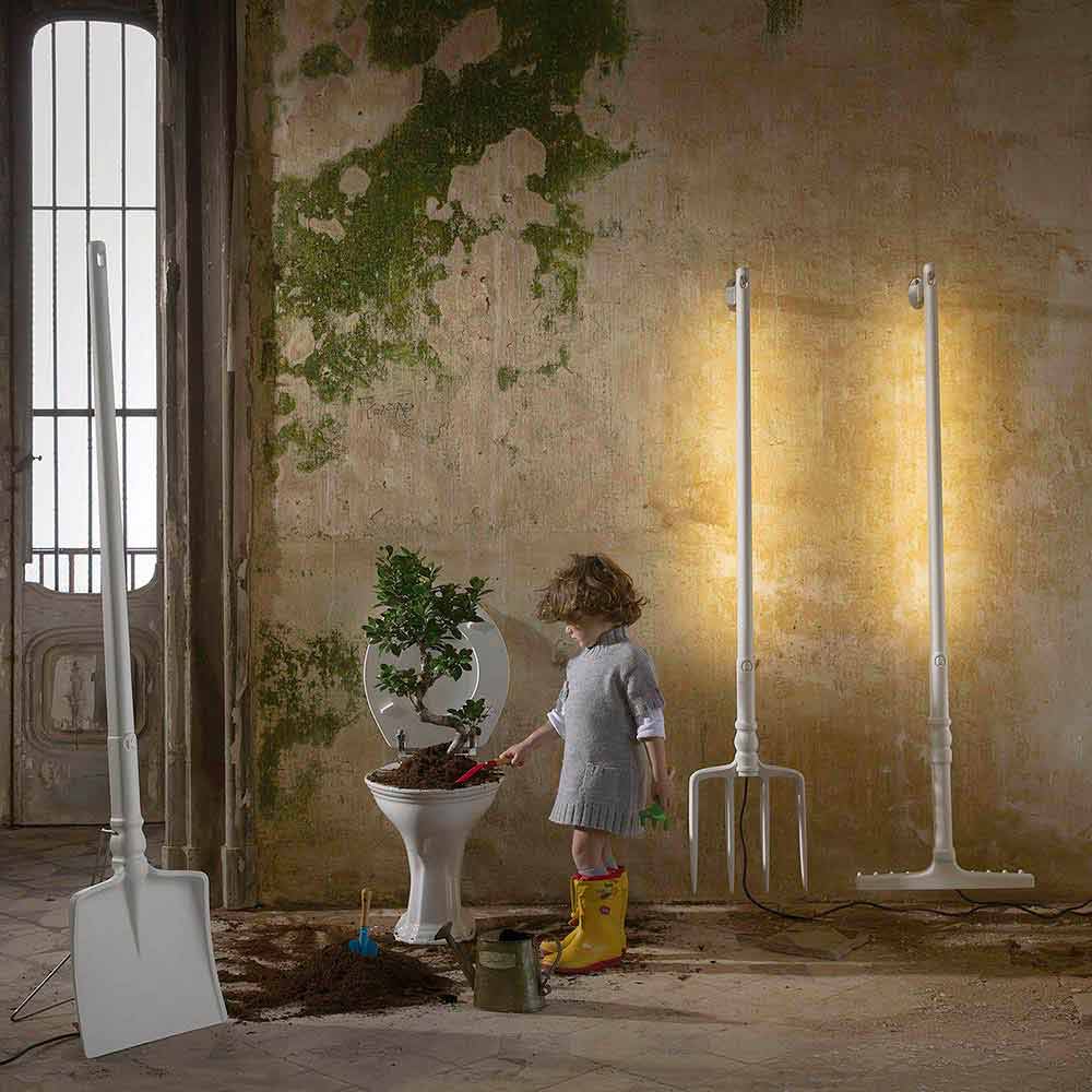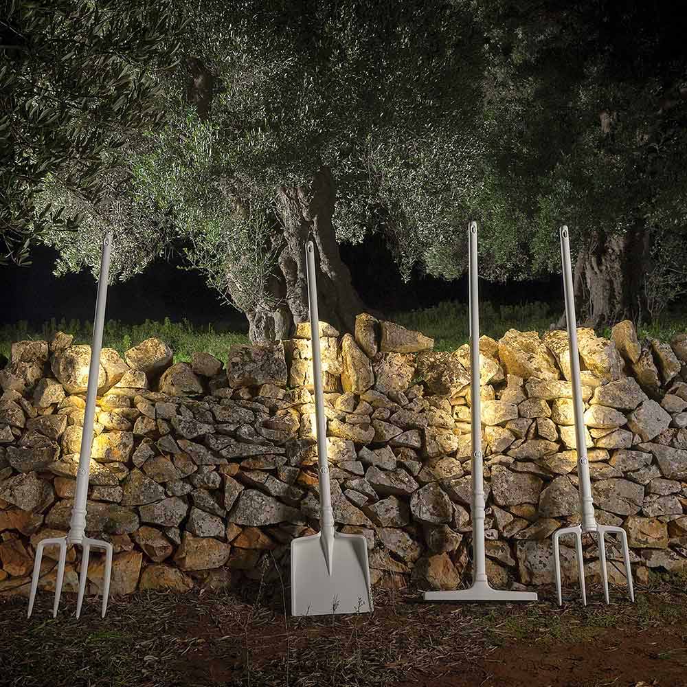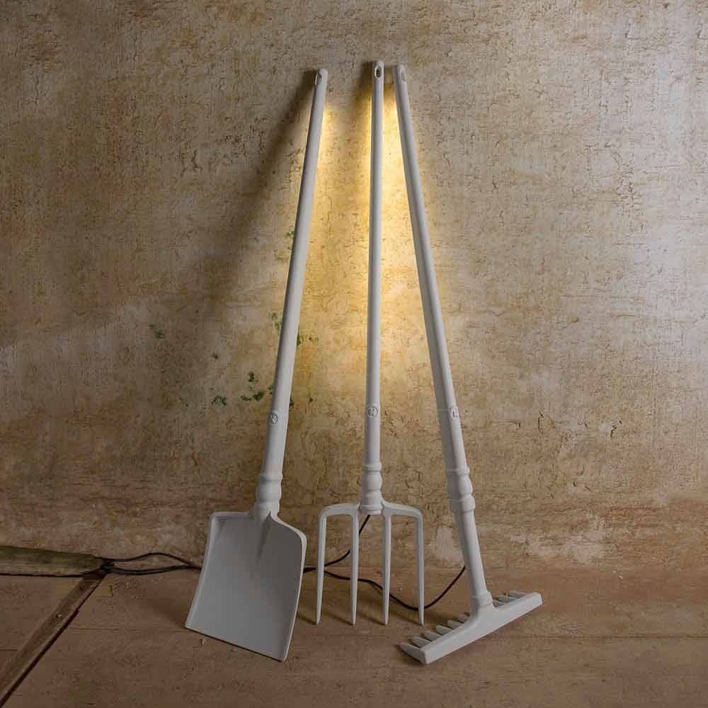 Esta original y única lámpara de pie para exterior está realizada en 3 formas diferentes para recordarnos las herramientas que cada vez se utilizan menos en la actualidad: la horquilla, la pala y el rastrillo.