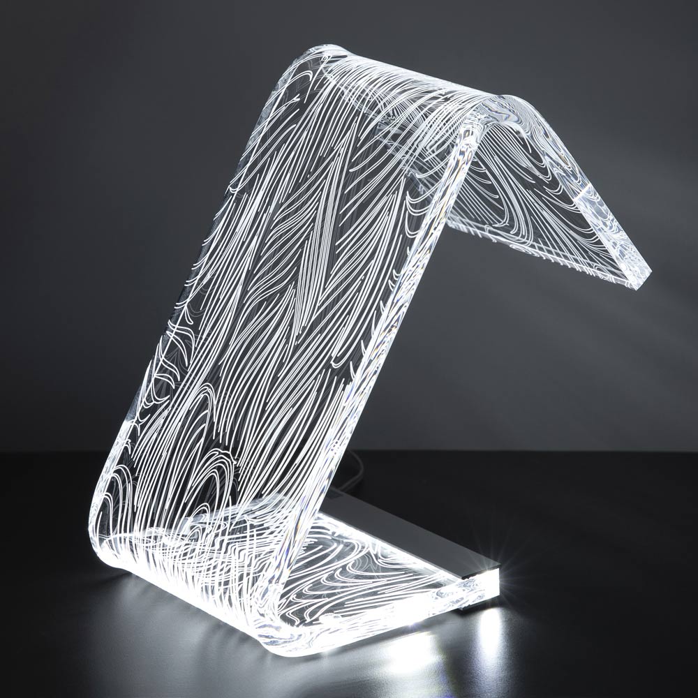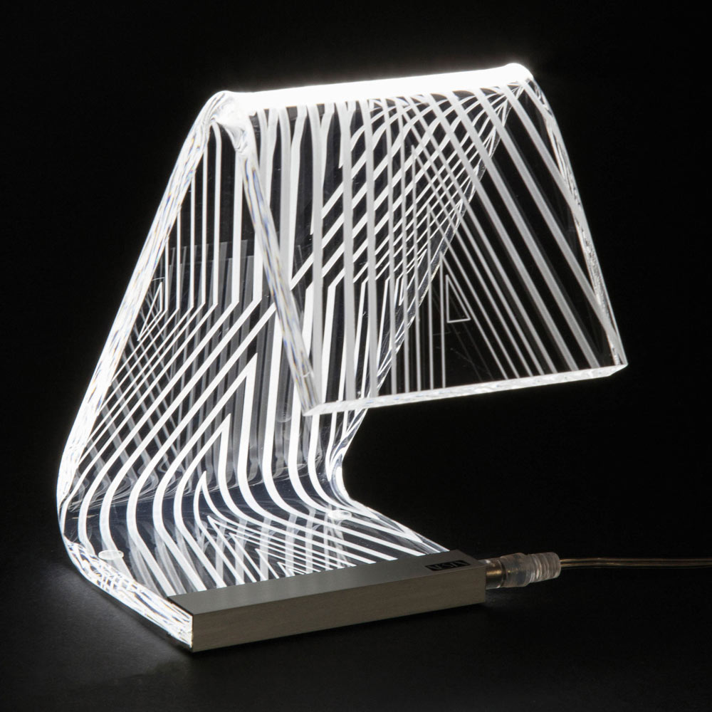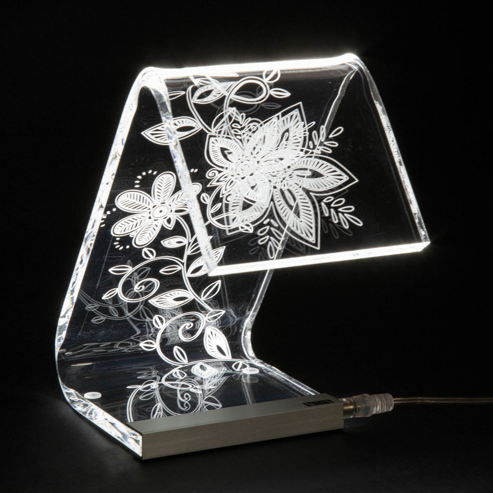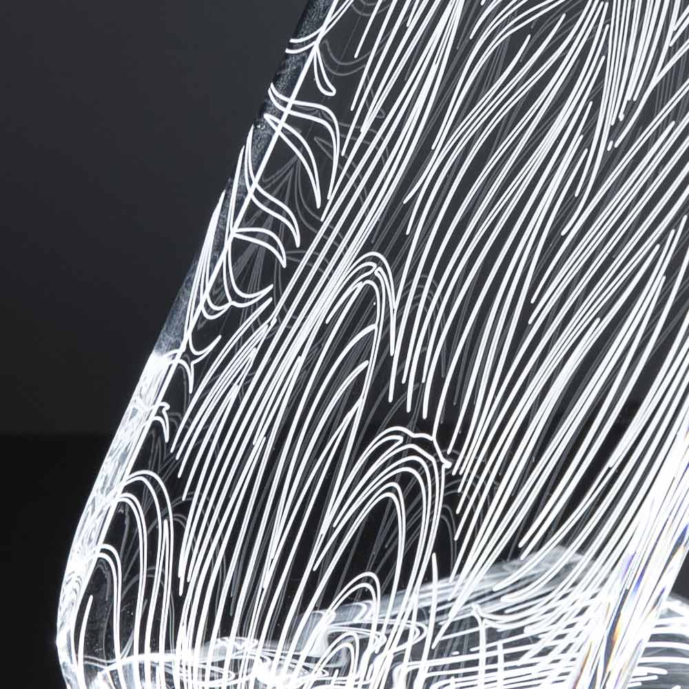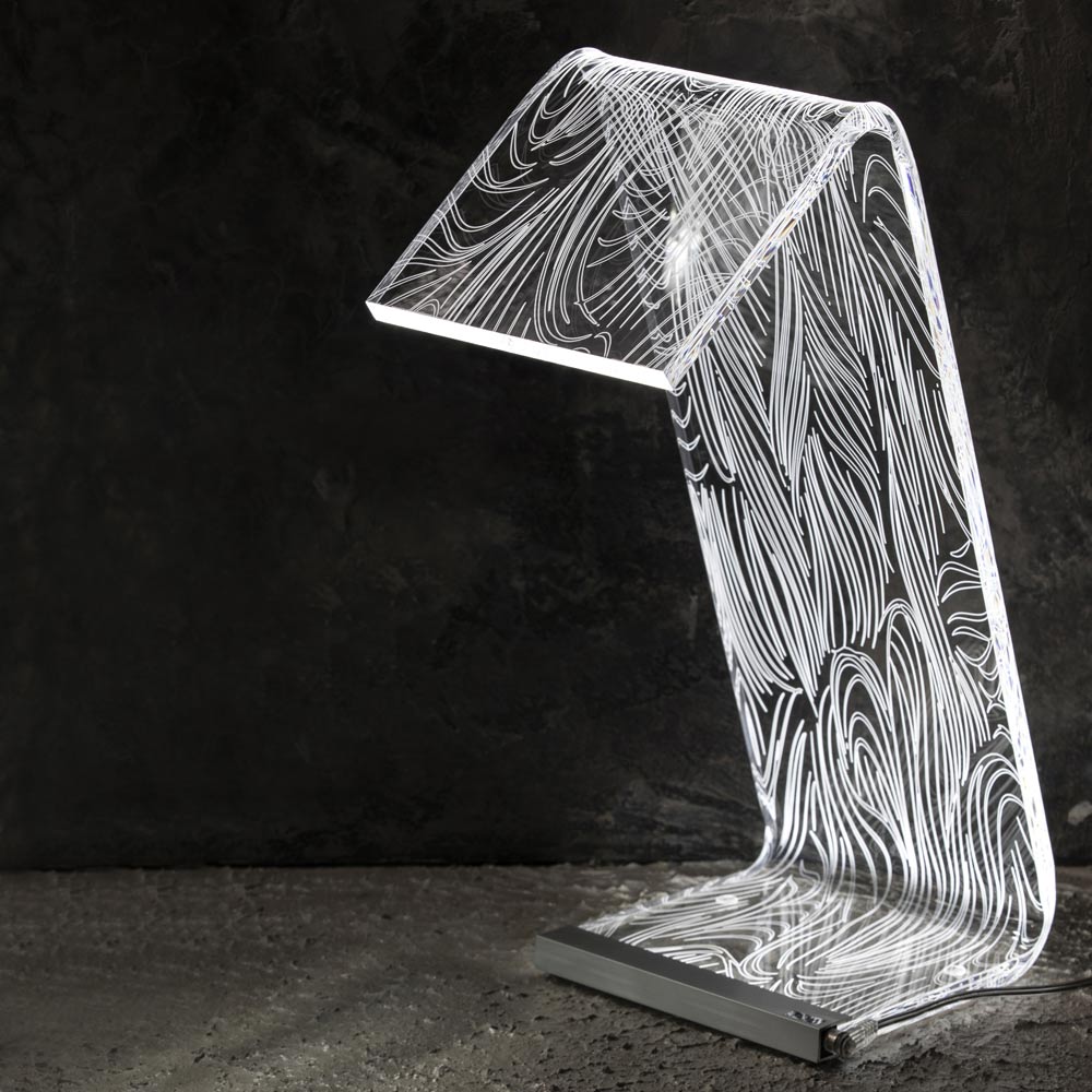 Lámpara de mesa de cristal acrílico transparente con decoraciones láser, 2 tamaños fabricada en Italia.