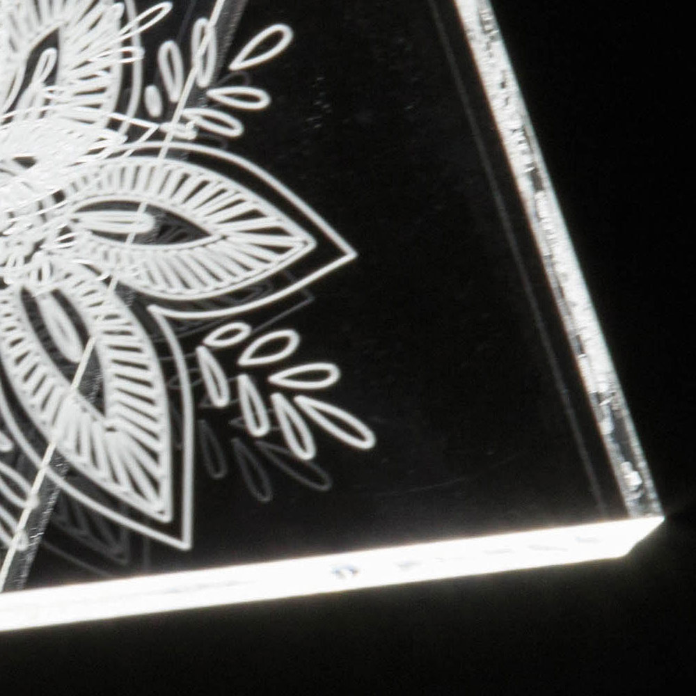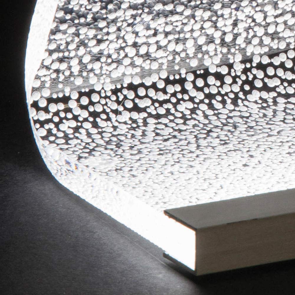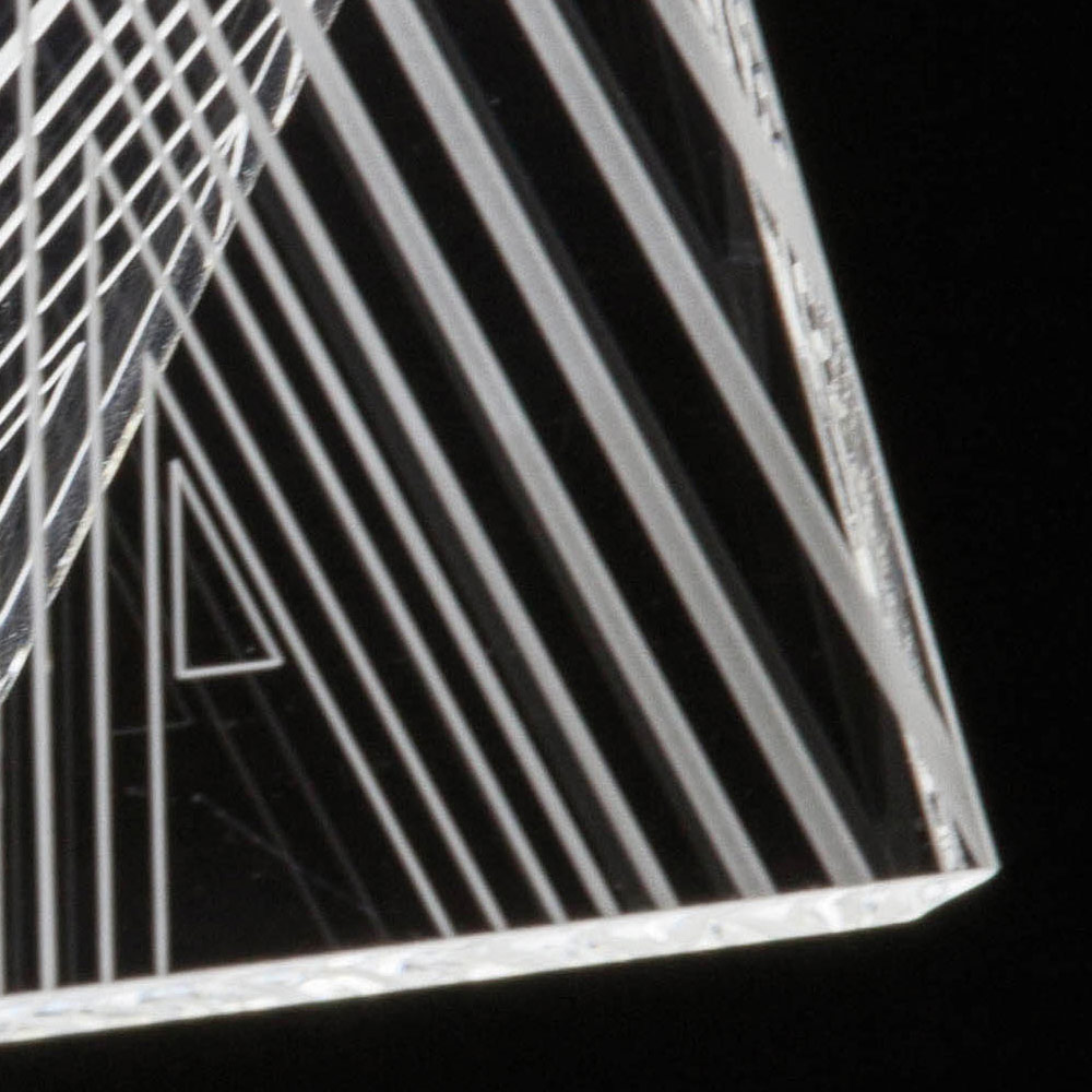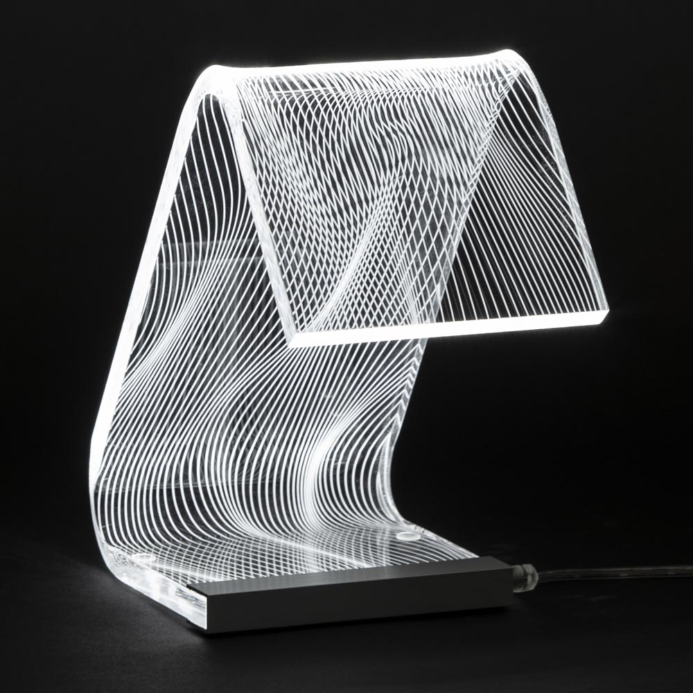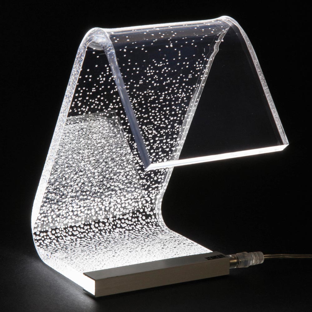Lámpara de mesa de cristal acrílico transparente con decoraciones láser, 2 tamaños fabricada en Italia.