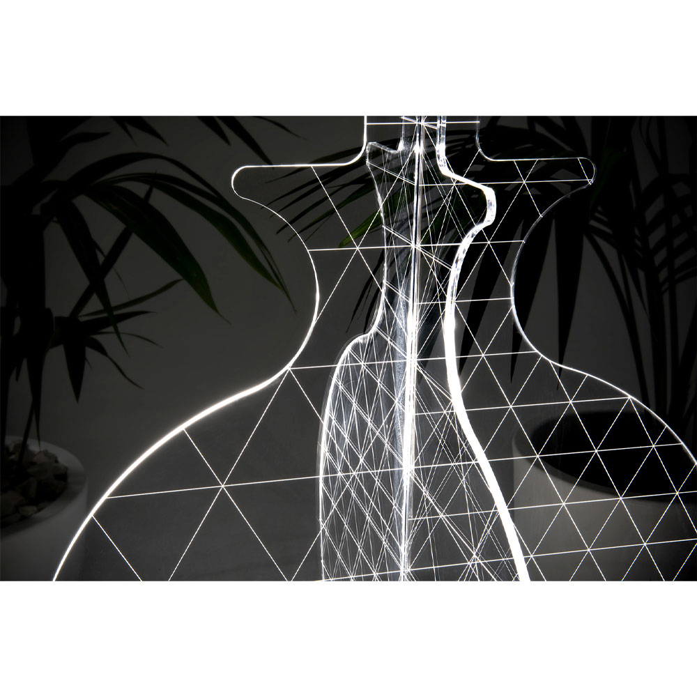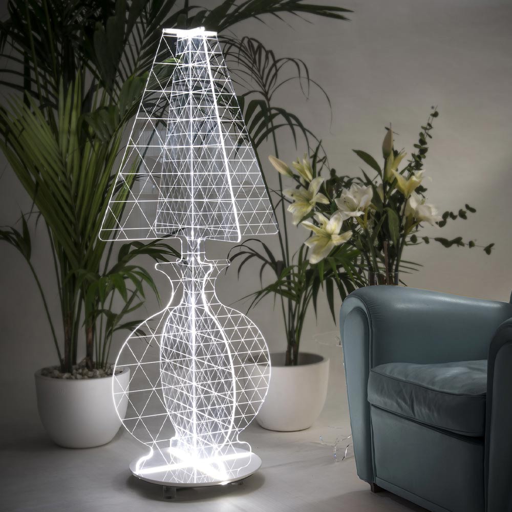 Esta lámpara de pie presenta un diseño originalmuy sofisticado y moderno , hábilmente marcado con láser para crear un fascinante entretejido geométrico. Fabricado en plexiglás polímero 100% virgen, gracias a sus características técnicas el cristal acrílico se ilumina realzando la forma del producto. Producto concebido, diseñado y fabricado en Italia , con materiales italianos, el brillo y el brillo del material se mantienen constantes e inalterables con el tiempo.