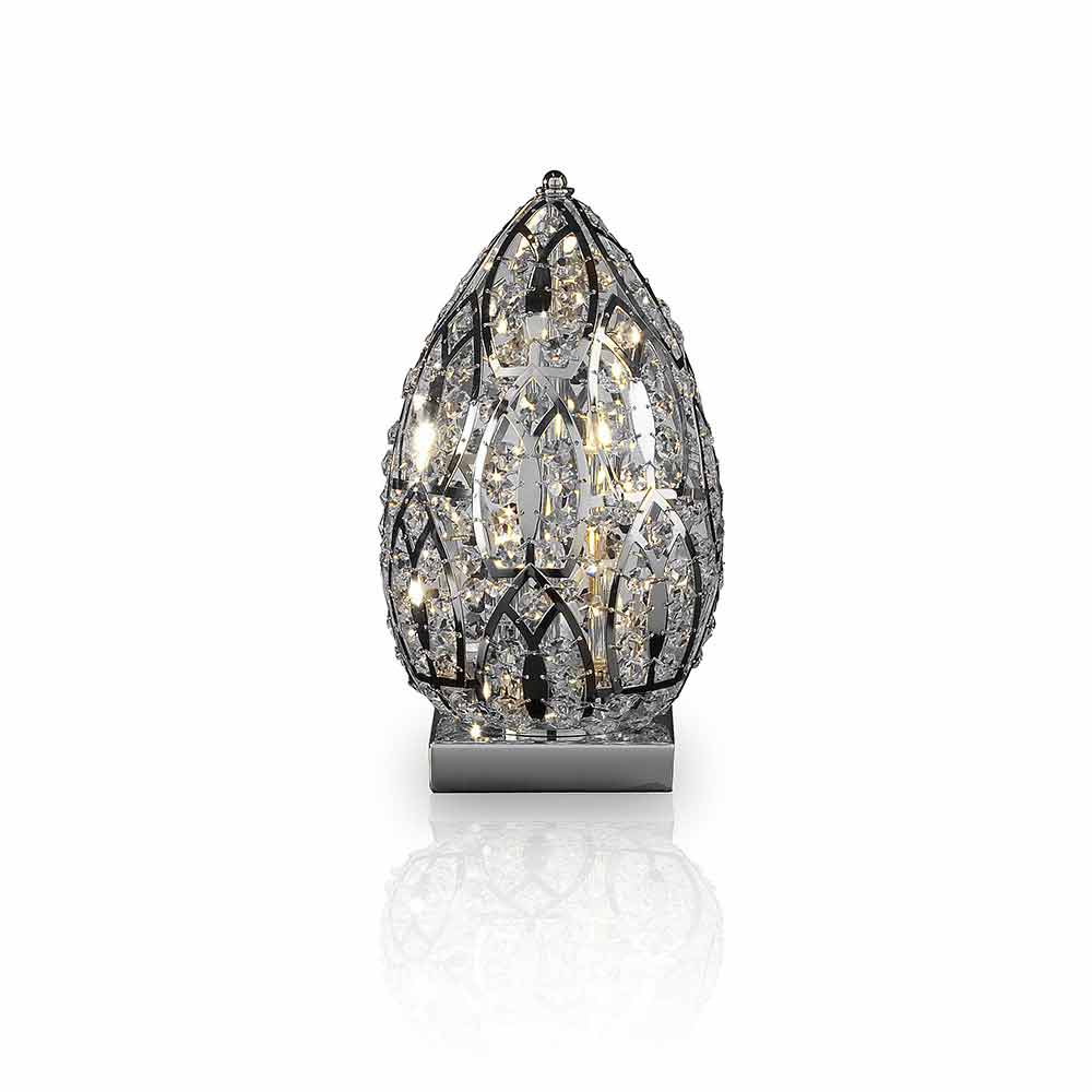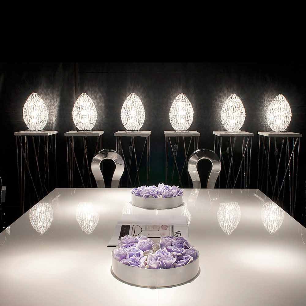Egg es una extraordinaria lámpara de sobremesa en forma de huevo, de diseño inimitable. La estructura en mallas de acero soldadas entre ellas permite realizar un acabado cromado lustroso.