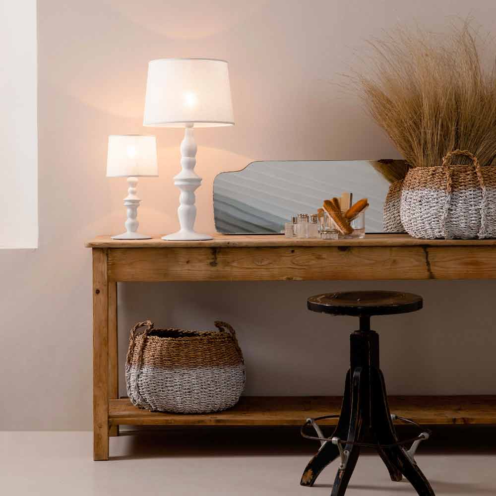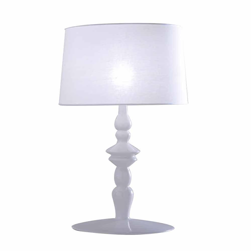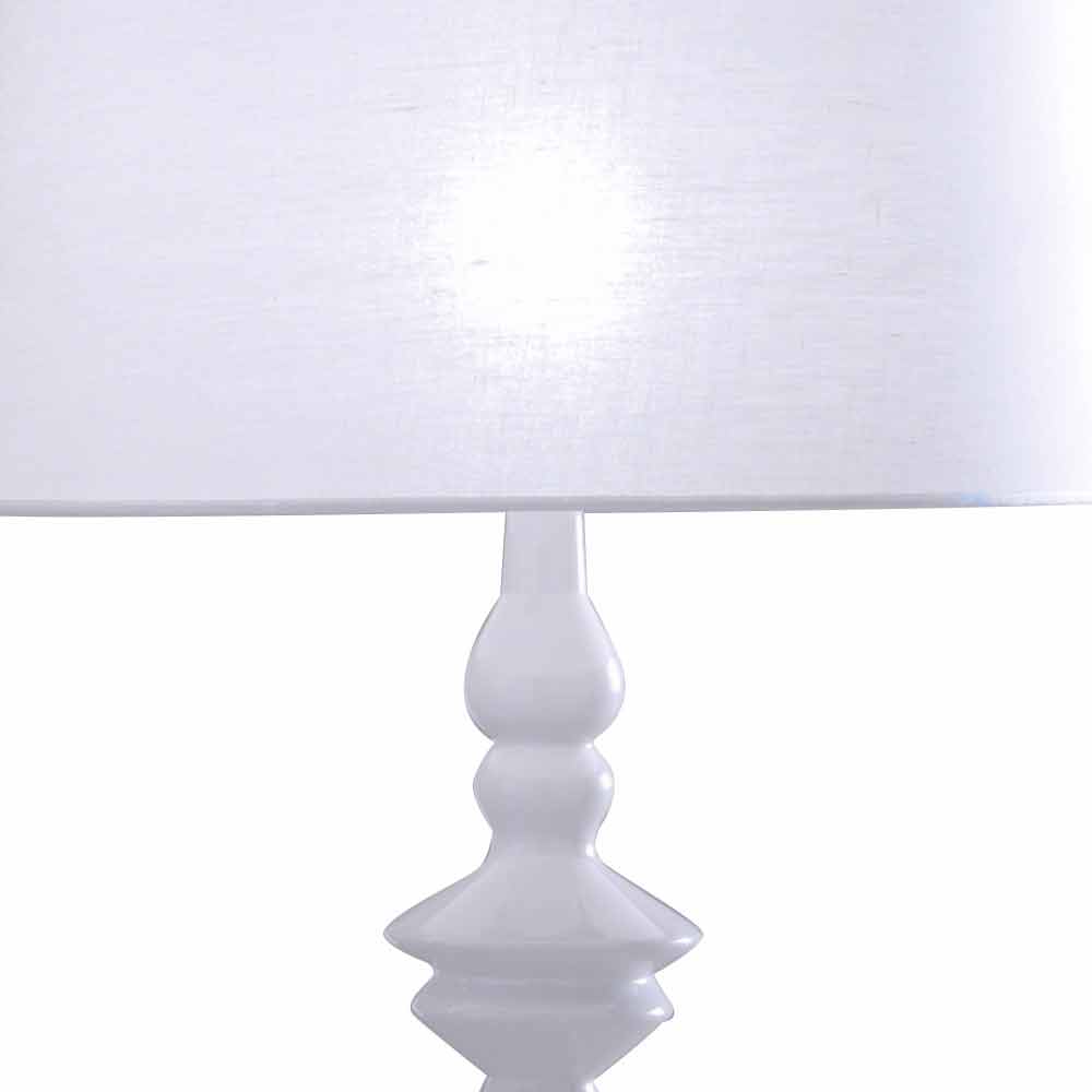 La lámpara está hecha de blanco brillante cerámica como un material que representa el origen, la maleabilidad, la creación y que conduce directamente a los orígenes de nuestra cultura. Pantalla en lino blanco.