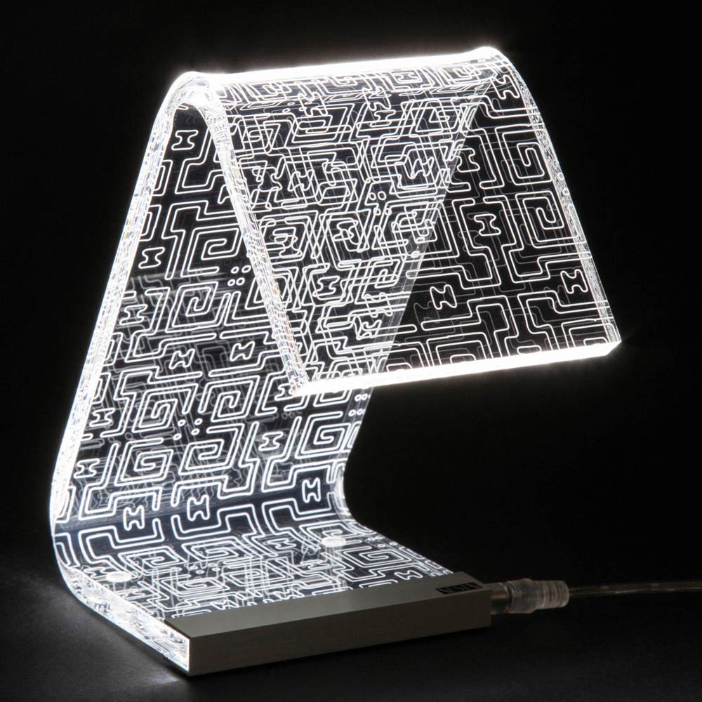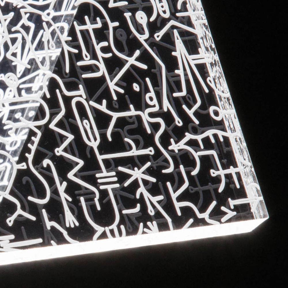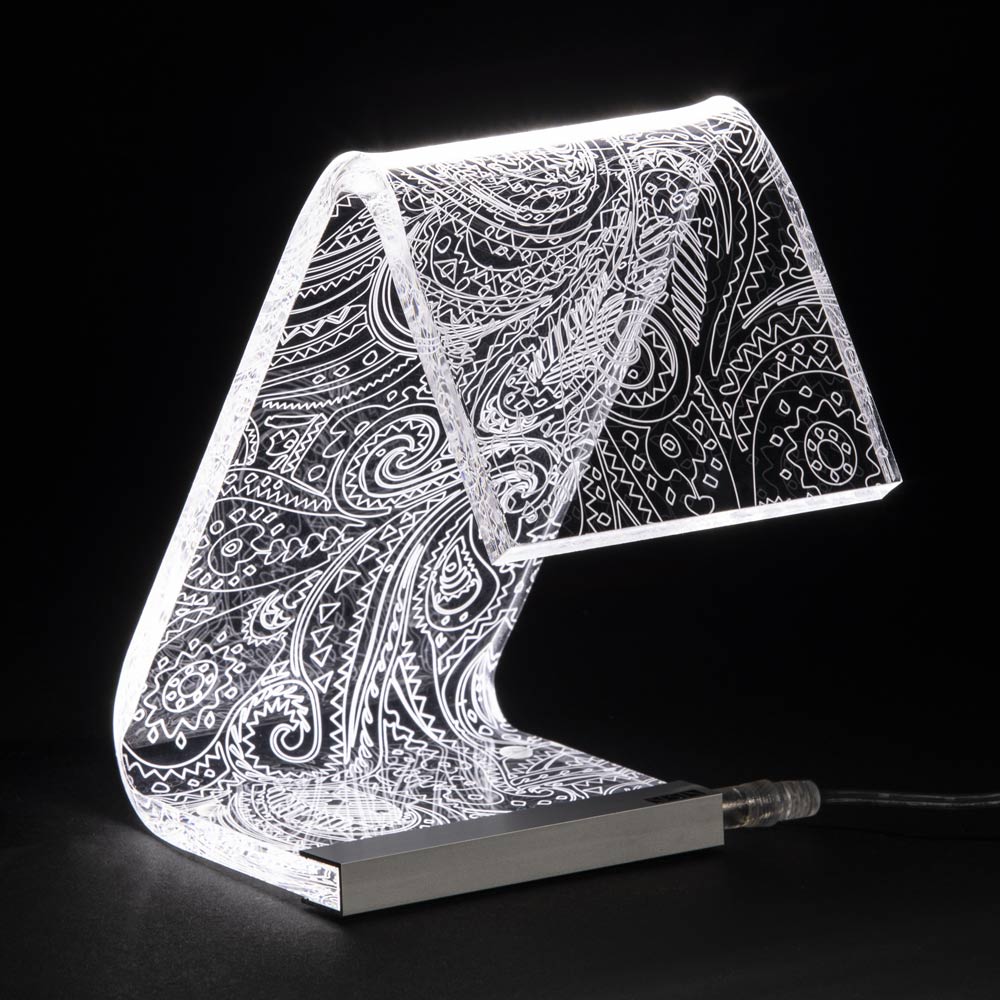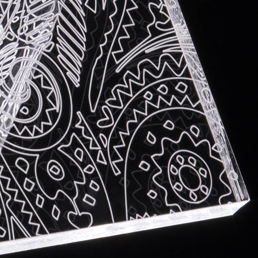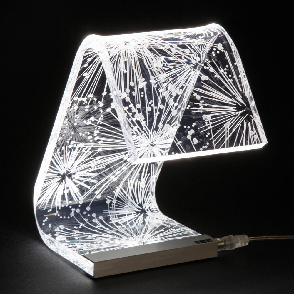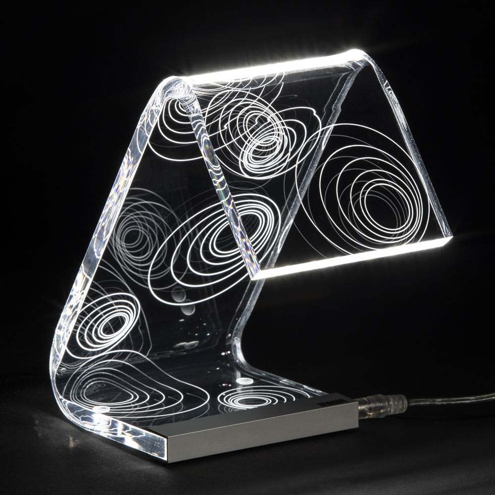 Lámpara de sobremesa en cristal acrílico transparente con decoraciones láser, 2 tamaños made in Italy.