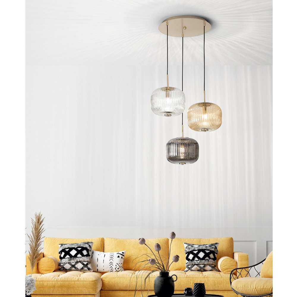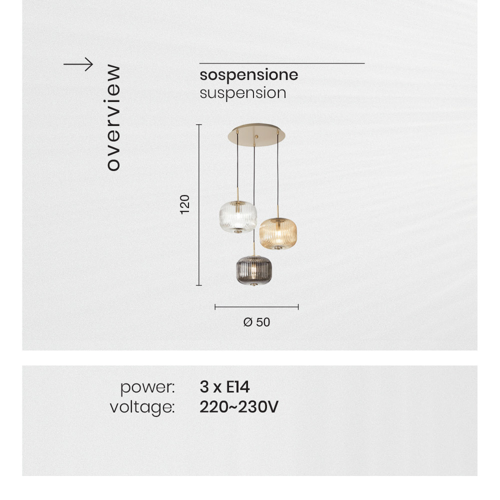 Lámpara de suspensión con estructura metálica en color dorado y tres difusores de vidrio soplado de color rayado. Un diseño salpicado de formas elegantes y refinadas que le dan a la habitación un gusto con clase, enriqueciendo su estética gracias a un toque exclusivo y una estética refinada e innovadora . Los tres maravillosos colores que subrayan la elegancia atemporal del vidrio soplado dan al aspecto final del producto su verdadera esencia delicada y su fuerte personalidad contemporánea , dando vida a una solución de decoración que es tan funcional como estéticamente impresionante y con un fuerte impacto visual. .