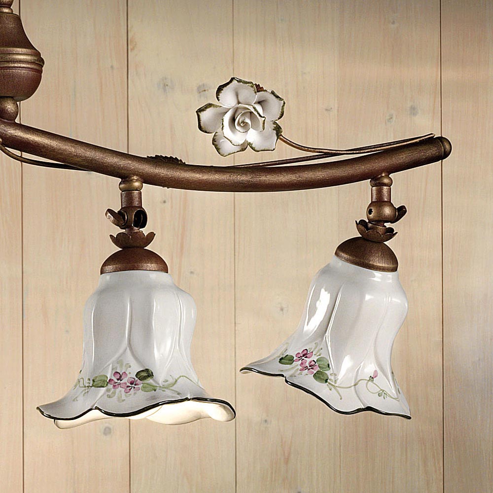 Plafón lineal 4 luces en metal y cerámica con rosas pintadas a mano fabricada en Italia por Ferroluce.