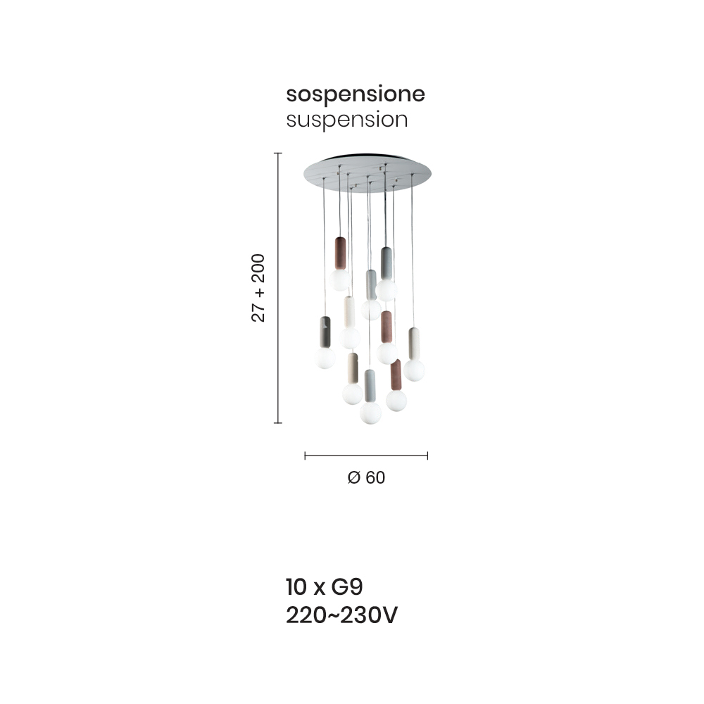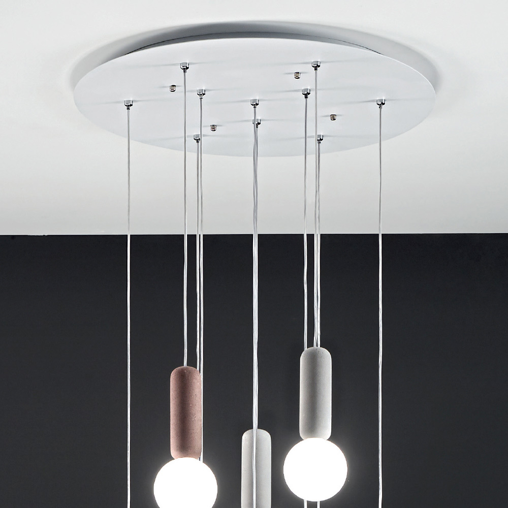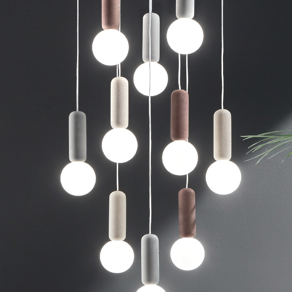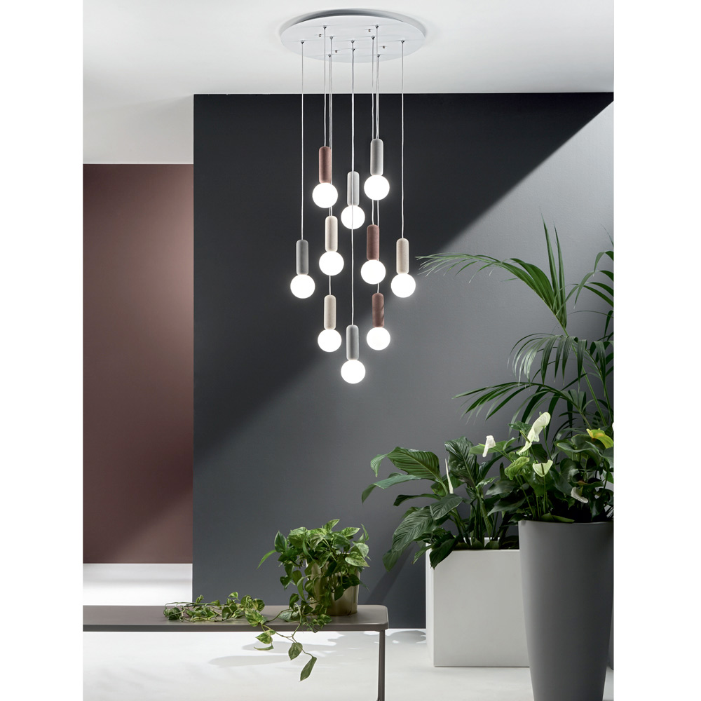 Lámpara de suspensión de 6 o 10 luces con estructura de hormigón y tulipas redondas en cristal blanco satinado con cables regulables en longitud. Una combinación inusual y creativa de materiales y acabados que da vida a una solución de decoración tan excéntrica como elegante y moderna. Los maravillosos matices de color elegidos para los componentes de hormigón se combinan a la perfección con el delicado y romántico acabado de las pantallas de vidrio para un resultado con una estética sofisticada y un fuerte impacto visual . Su conformación que se desarrolla sobre un diseño vertical lo convierte en una perfecta idea de decoración para iluminar comedores, salones, cocinas o dormitorios con un gusto contemporáneo, dando al ambiente un toque de estilo único .