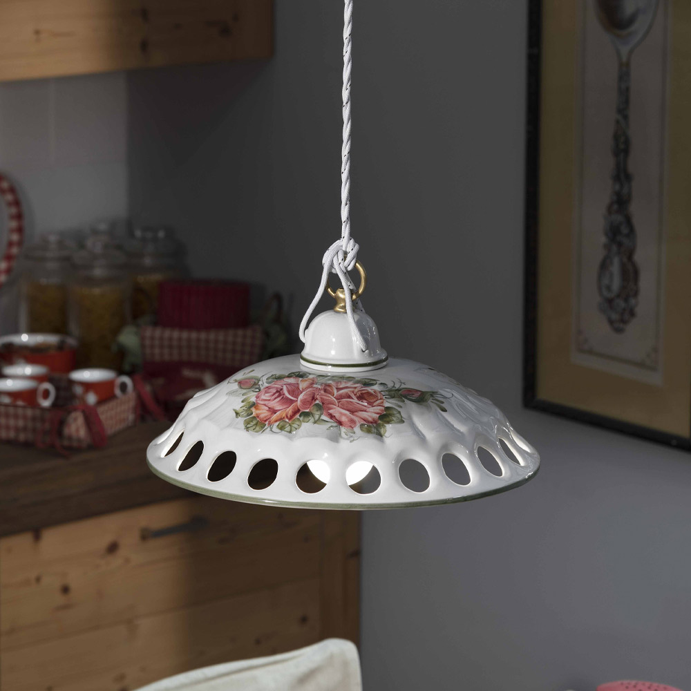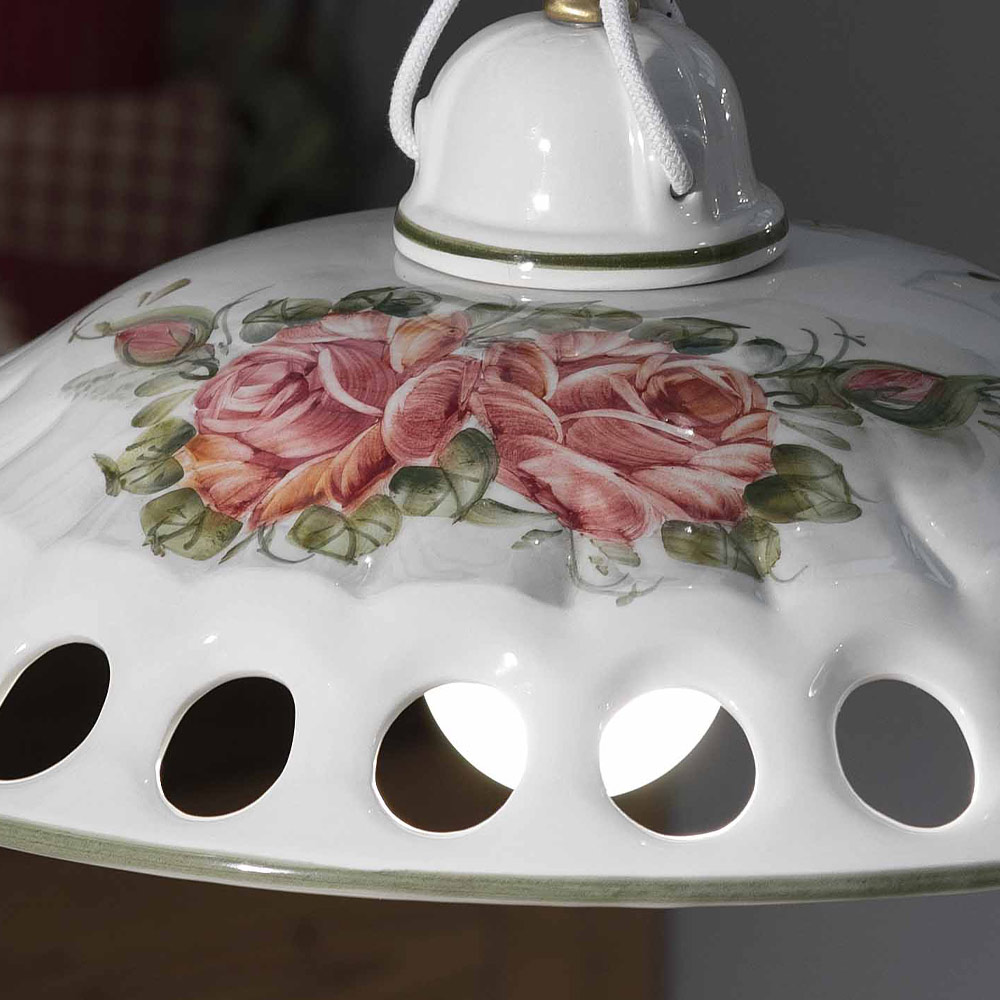 Esta lámpara colgante está realizada íntegramente en metal y cerámica pintada a mano con adornos florales que destacan la habilidad y destreza de los artesanos.