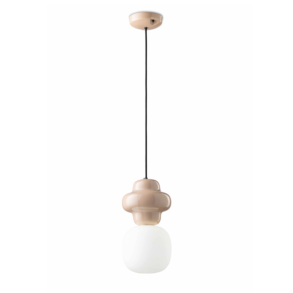 Lámpara de suspensión realizada en cerámica coloreada , difusor de cristal opalino satinado y cable revestido de algodón, íntegramente Made in Italy.