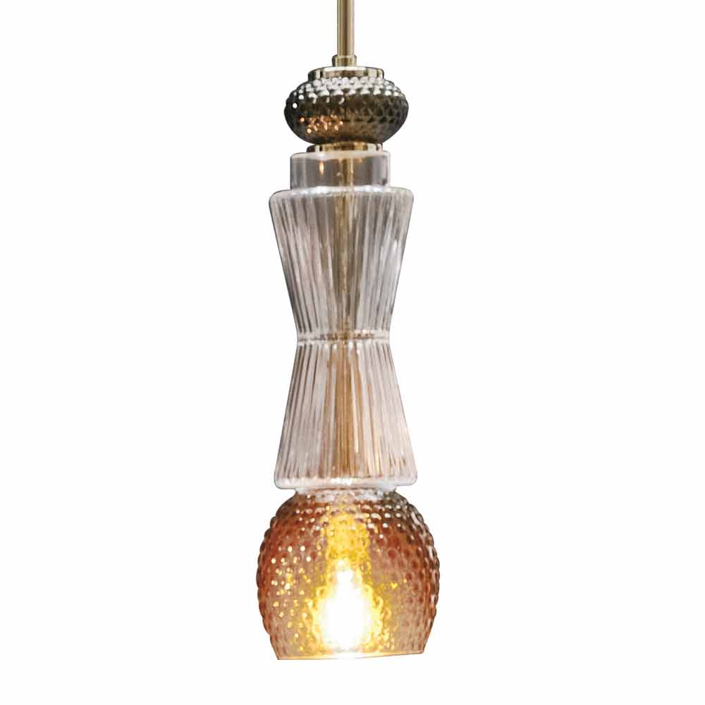Lámpara de suspensión en cristal de Murano con detalles dorados y cable textil, Made in Italy.