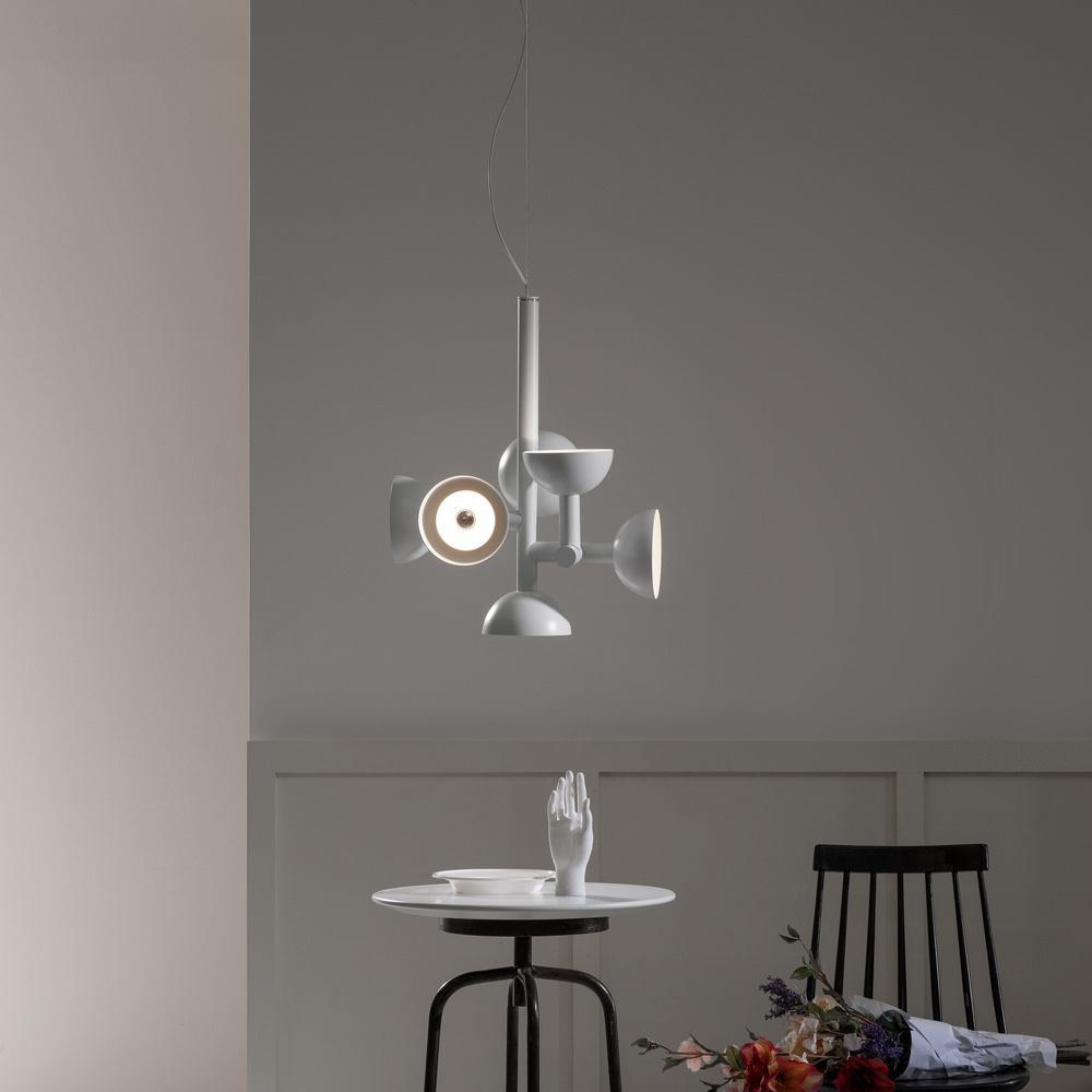 La lámpara está realizada con una estructura de aluminio de dos acabados para un diseño íntegramente italiano que, a través de la experimentación poco convencional y la búsqueda continua entre tradición y modernidad , es capaz de asombrar, atrever y emocionar, permitiéndote expresar tus emociones a través de un original y personal. uso decorativo de la luz.