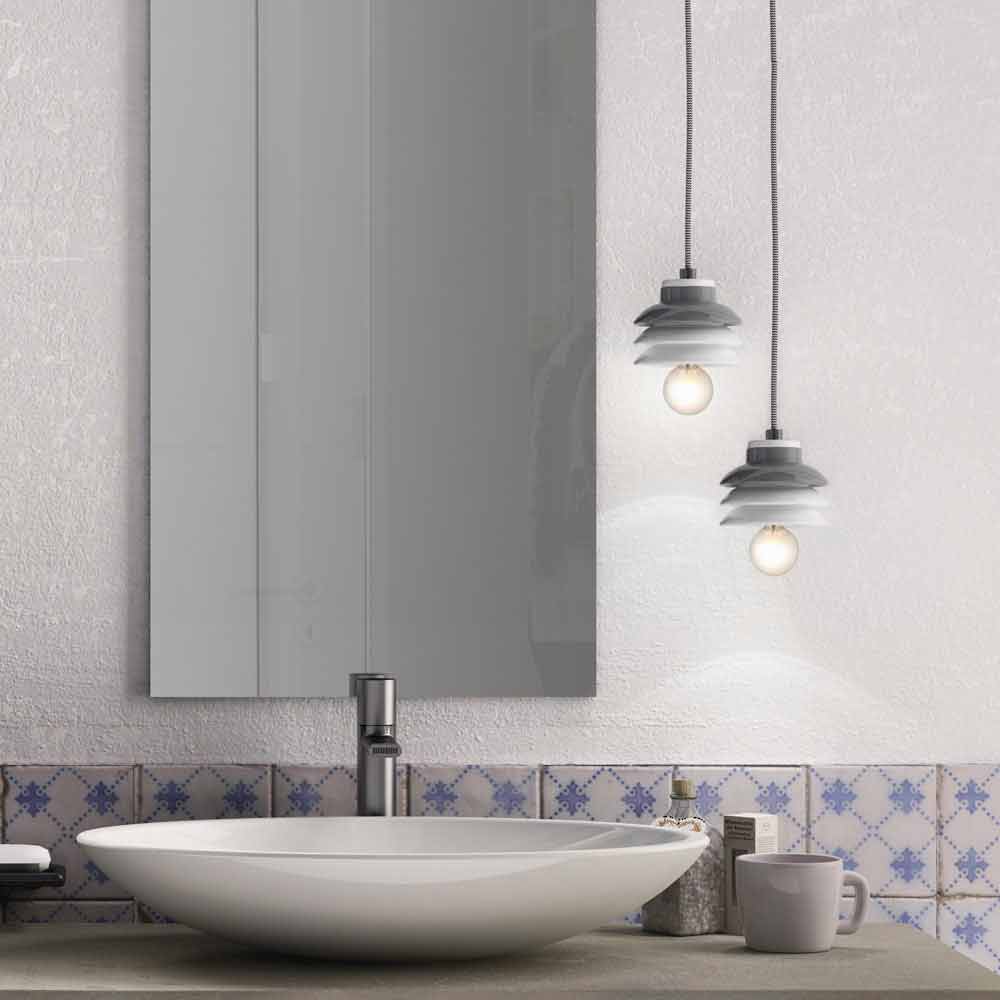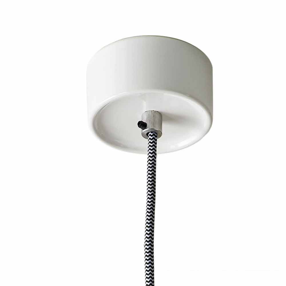 Hecho en Italia por maestros artesanos en cerámica blanca y gris, con cable de tela blanco y negro y la abrazadera de aluminio.