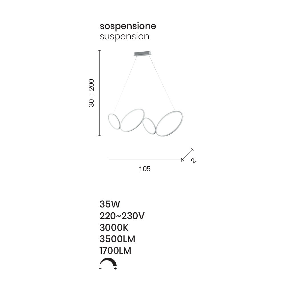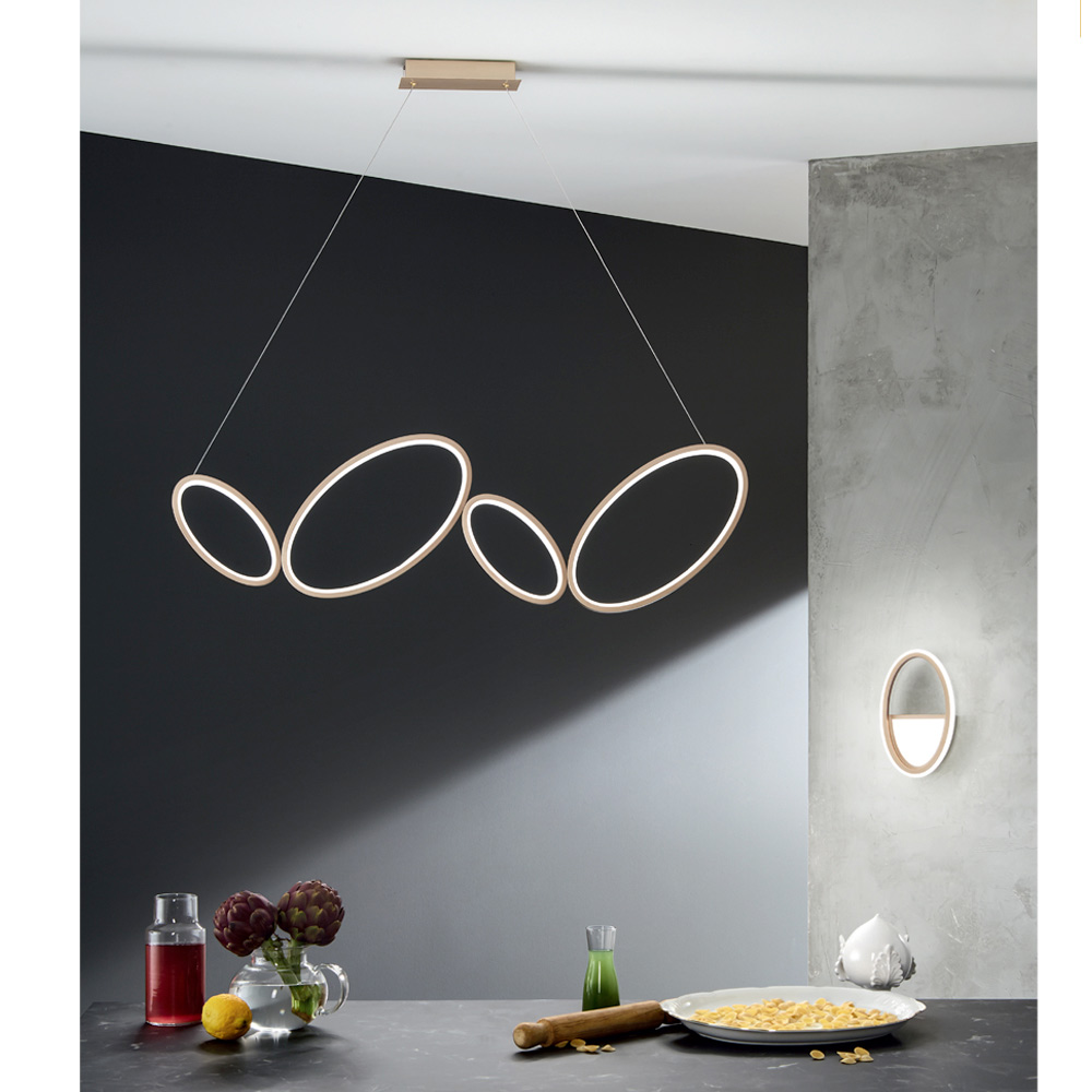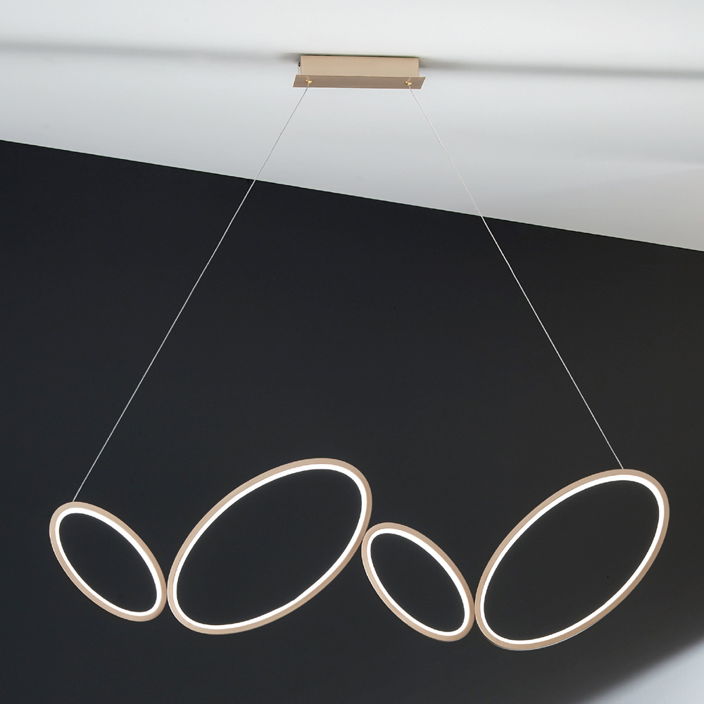 Lámpara de suspensión con estructura metálica acabado dorado y difusor de acrílico y siliconacompleto con fuente de luz LED regulable . Una estética moderna y exclusiva caracterizada por el uso de formas ovaladas de diferentes tamaños para dar vida a un diseño refinado e innovador capaz de conquistar el centro de atención en espacios domésticos como comedores, cocinas, salones o dormitorios. Cama con muebles contemporáneos. El maravilloso acabado dorado que subraya toda la estructura le da al producto su personalidad, elegancia y su carácter innovador , dando vida a una solución perfecta para quienes aman amueblar su hogar mediante el uso de objetos con un estilo único.