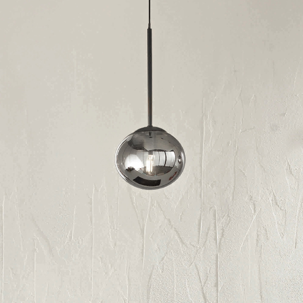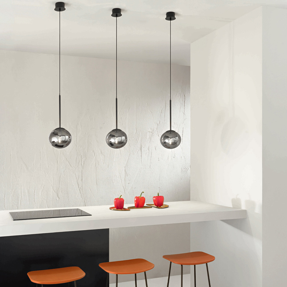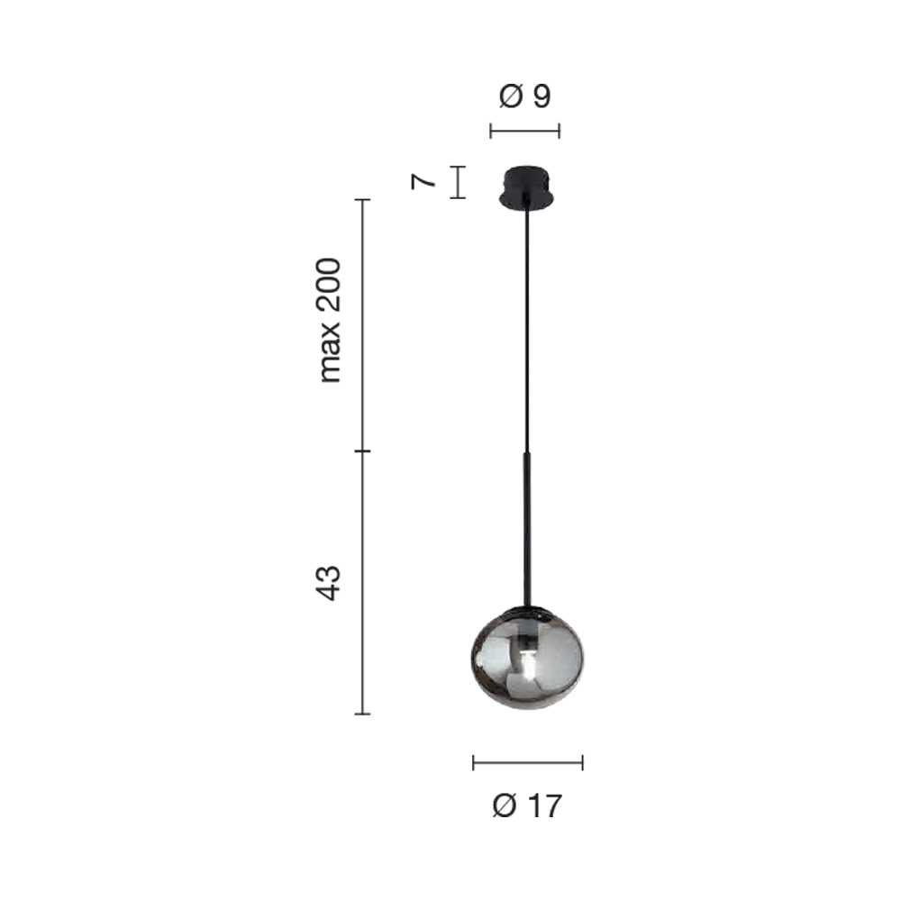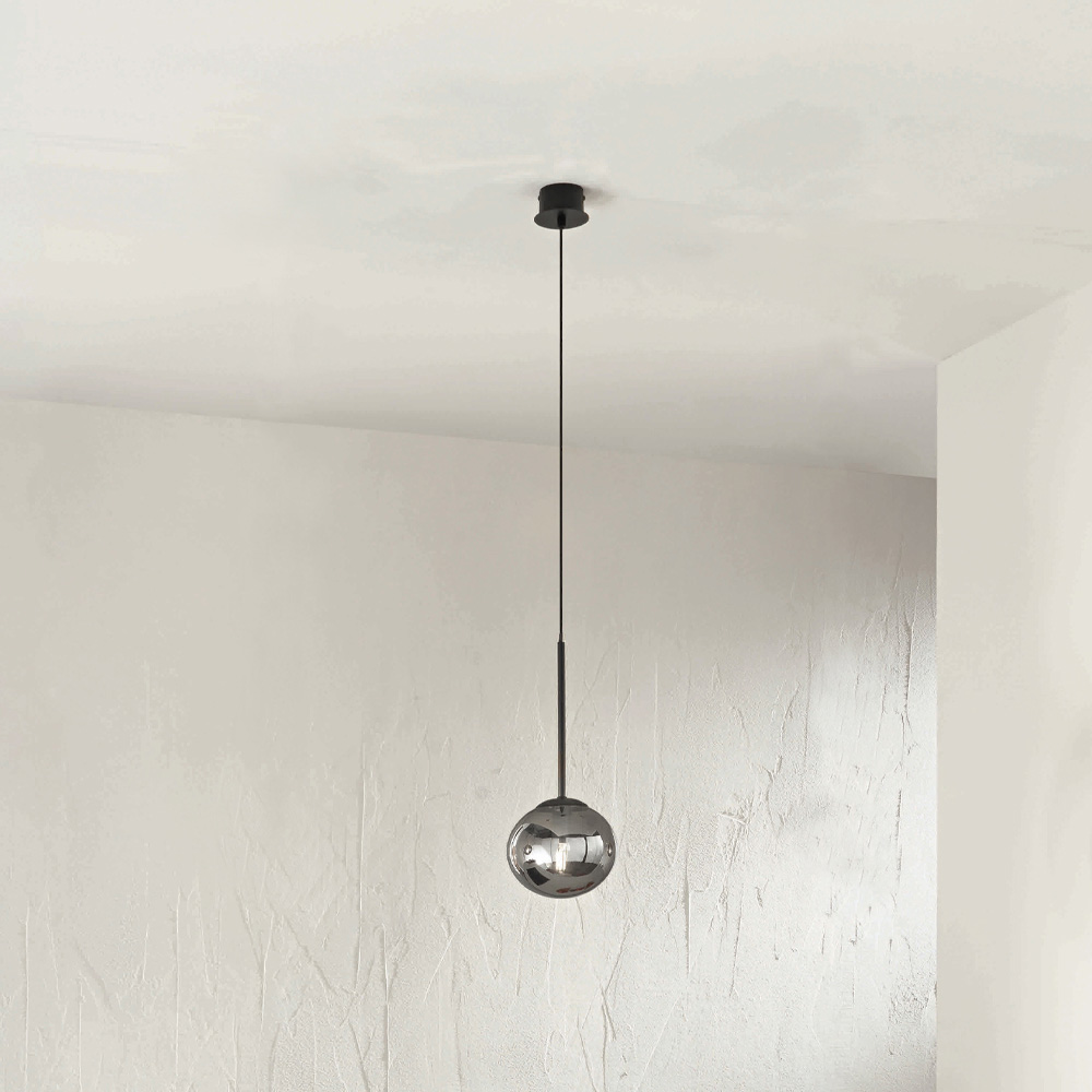 Lámpara de suspensión íntegramente producida en Italia realizada en metal pintado y cristal soplado acabado negro con luz LED y cable regulable en longitud.